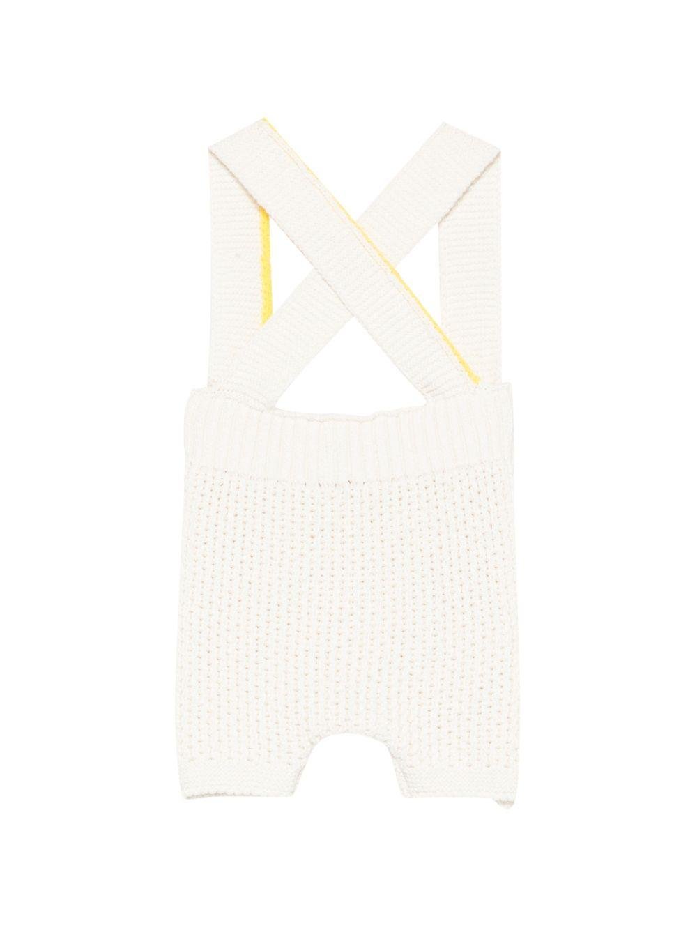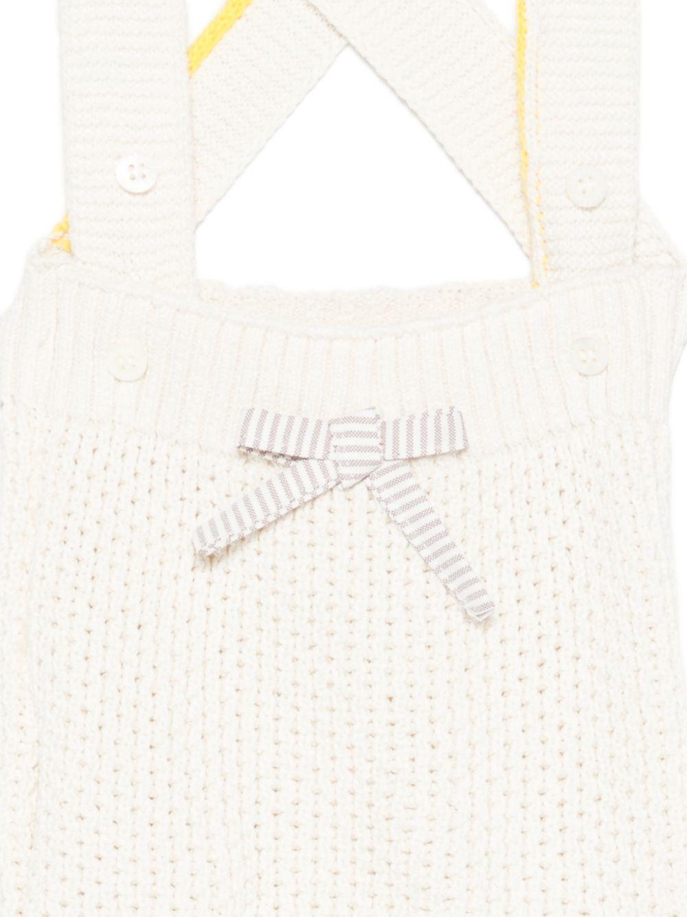 Il prodotto Tutina per neonati Gensami bianca con dettaglio fiocco sul davanti è disponibile sullo store online RubinoKids.com. Realizzato in seta di gelso 55%, cotone 45%. Il prodotto presenta un colore bianco sporco, dettaglio fiocco sul davanti, spalline incrociate sul retro, inserti gialli, lavorazione in maglia. Varie taglie a catalogo, appartiene alla collezione Gensami Primavera/Estate 2026 ed è disponibile con consegna in 24/48h per l'Italia.