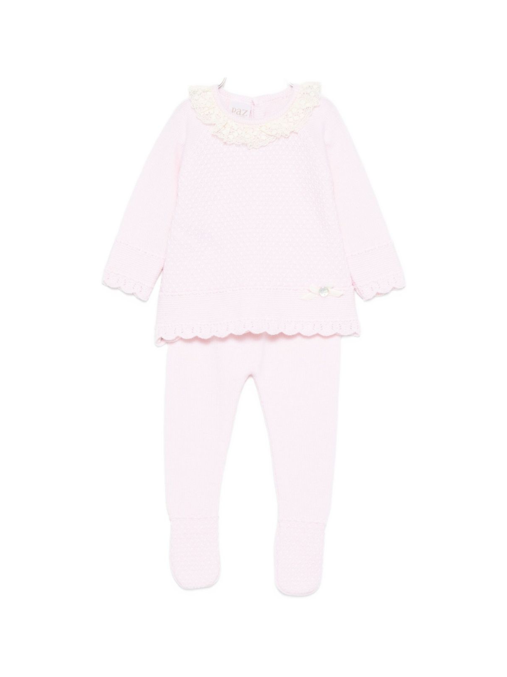 Il prodotto Set maglia e pantaloni per neonata Paz Rodríguez rosa con maglia in pizzo è disponibile sullo store online RubinoKids.com. Realizzato in tessuto 100%. Il prodotto presenta un colore rosa, colletto in pizzo, orlo smerlato, dettaglio fiocco, chiusura con bottoni. Varie taglie a catalogo, appartiene alla collezione Paz Rodríguez Autunno/ Inverno 2025 ed è disponibile con consegna in 24/48h per l'Italia.
