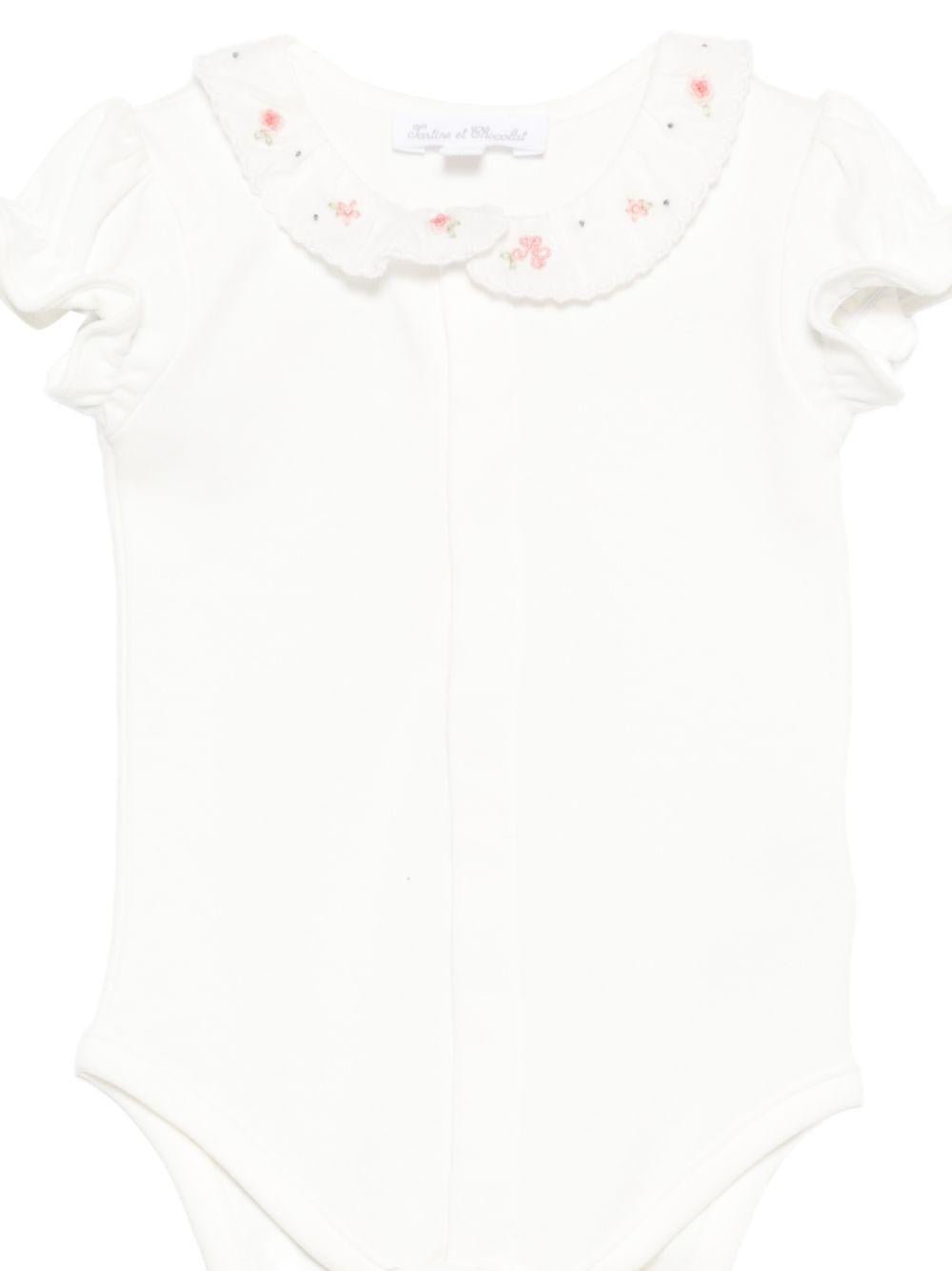Il prodotto Tutina per neonata Tartine Et Chocolat bianca con colletto alla Peter Pan è disponibile sullo store online RubinoKids.com. Realizzato in cotone 100%. Il prodotto presenta un colore bianco, colletto alla Peter Pan, ricamo floreale, maniche con ruches, maniche corte, chiusura con bottoni a pressione. Varie taglie a catalogo, appartiene alla collezione Tartine Et Chocolat Primavera/Estate 2026 ed è disponibile con consegna in 24/48h per l'Italia.