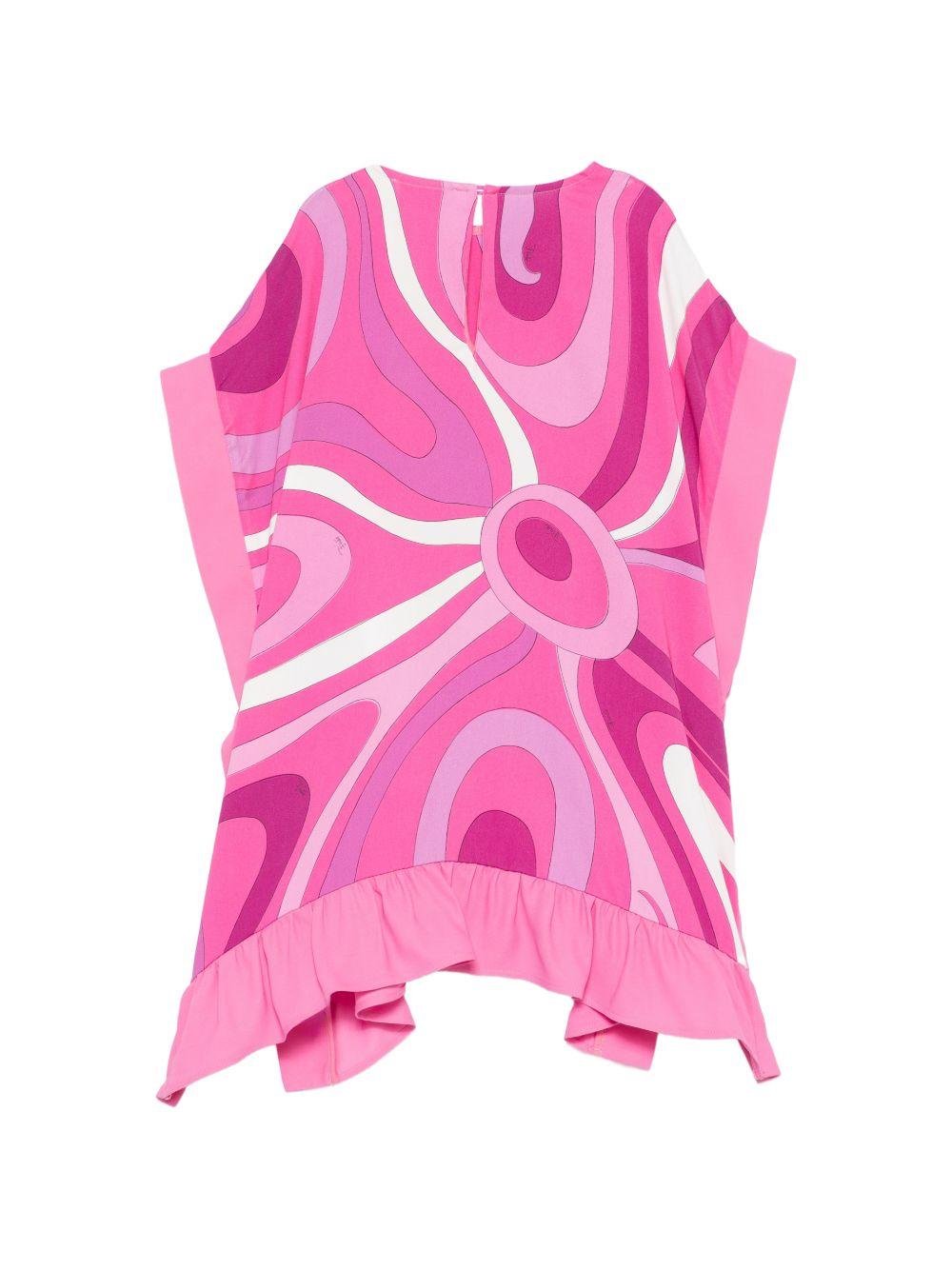 The Emilio Pucci Junior pink dress for girls with graphic print is available on the RubinoKids.com online store. Made of 100% viscose, it features a pink color, a graphic print, a gathered hem, short sleeves, a crew neck, and a keyhole back. Available in various sizes, it is part of the Emilio Pucci Junior Spring/Summer 2026 collection and is available for 24-48 hour delivery in Italy.