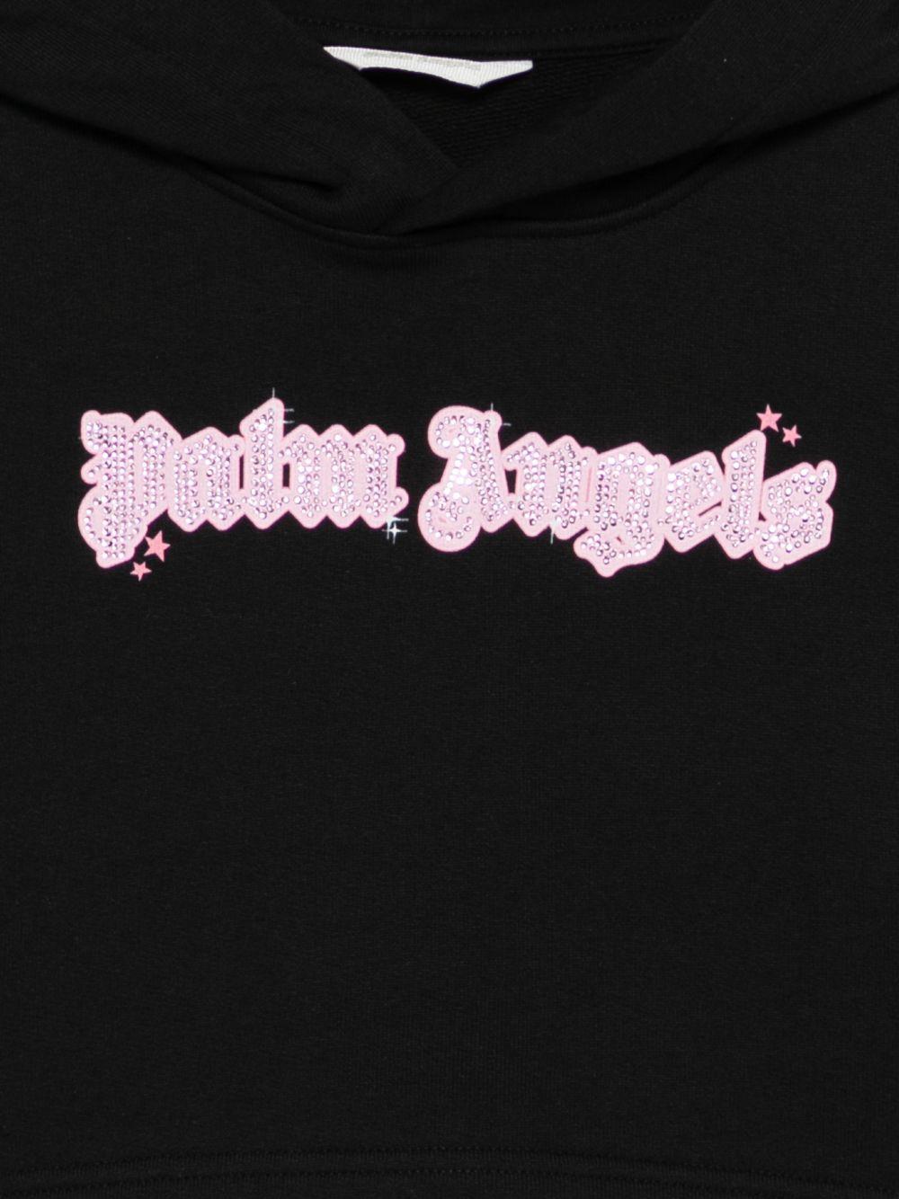 The Palm Angels Kids black sweatshirt for girls with a decorated hood is available on the RubinoKids.com online store. Made of 100% cotton, it features a black color, a decorated hood, long sleeves, and a short length. Available in various sizes, it is part of the Palm Angels Kids Spring/Summer 2026 collection and is available for immediate shipment with delivery within 24-48 hours in Italy.