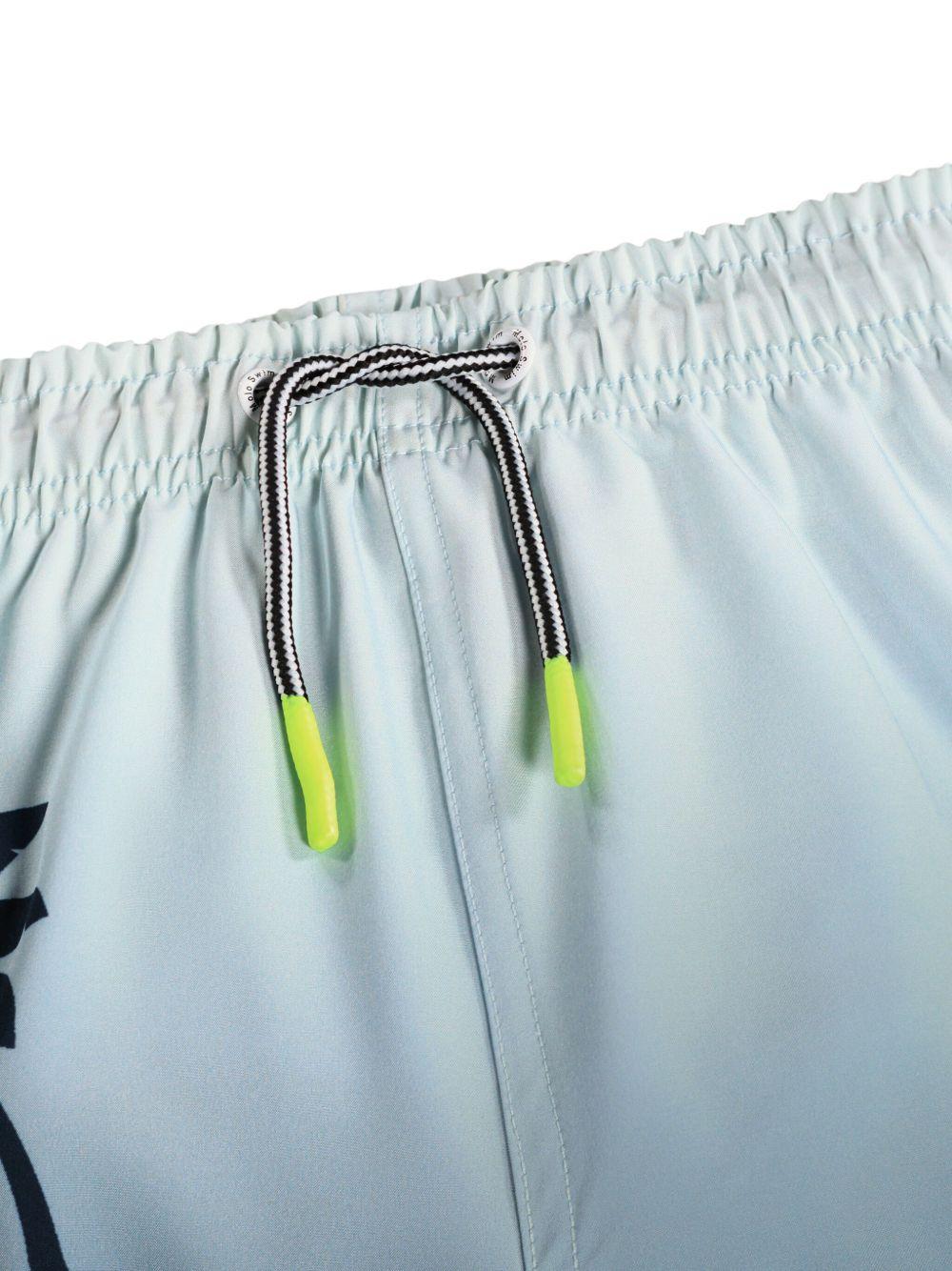 The Molo Niko blue swimwear for boys with palm tree print is available on the RubinoKids.com online store. Made of 92% recycled polyester, 8% elastane. The product features a light blue color, faded effect, Palm Tree print, smile print, drawstring fastening, and a shaped back pocket. Various sizes are available in the catalog, it belongs to the Molo Spring/Summer 2026 collection and is available with 24/48h delivery for Italy.
