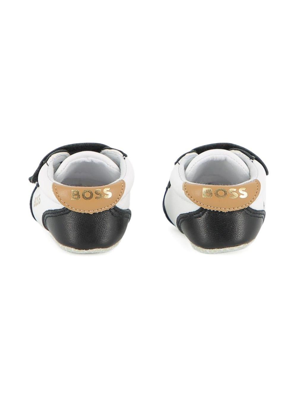 The Boss Kids black and white baby first steps shoes with insert design are available on the RubinoKids.com online store. Made of 100% calfskin, they feature a black and white color scheme, a velcro closure, a round toe, a contrasting heel counter, and a gold-tone logo. Available in various sizes, they are part of the Boss Kids Spring/Summer 2026 collection and are available for 24-48 hour delivery in Italy.