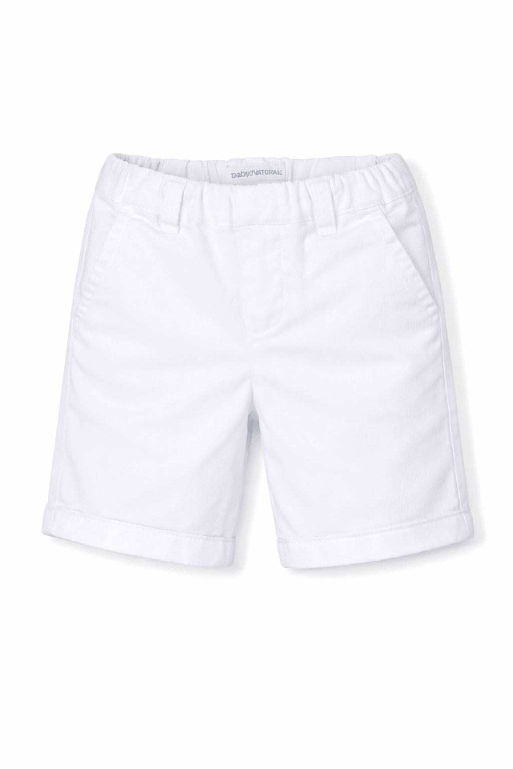 The Emporio Armani Kids white baby shorts with logo plaque are available on the RubinoKids.com online store. Made from 97% cotton and 3% elastane, they are white, a cotton blend, with a logo plaque, belt loops, an elasticated waistband at the back, a straight fit, two side pockets, two back welt pockets, a straight hem, and a knee-length design. Available in various sizes, they are part of the Emporio Armani Kids Spring/Summer 2026 collection and are available for delivery in Italy within 24-48 hours.