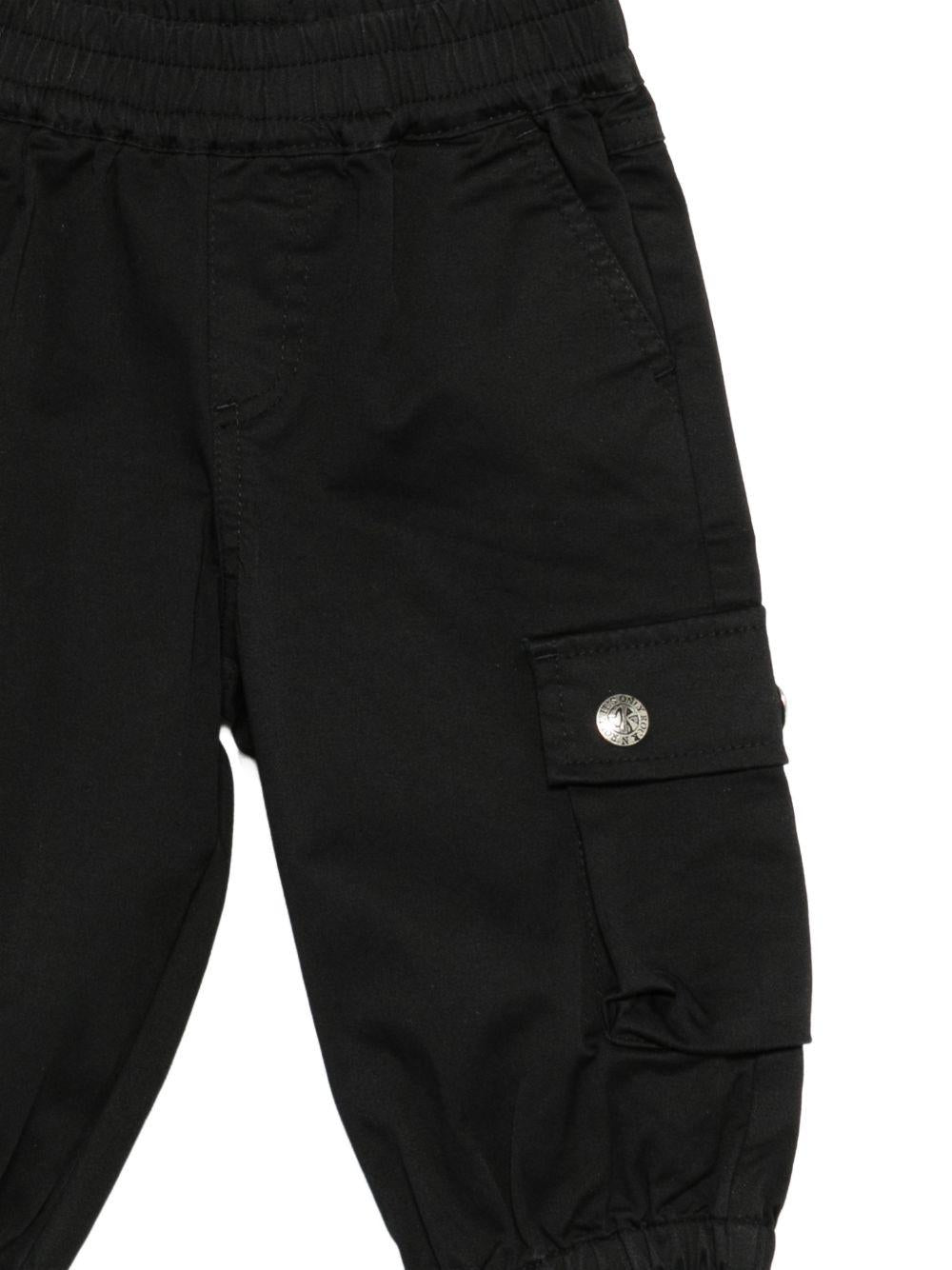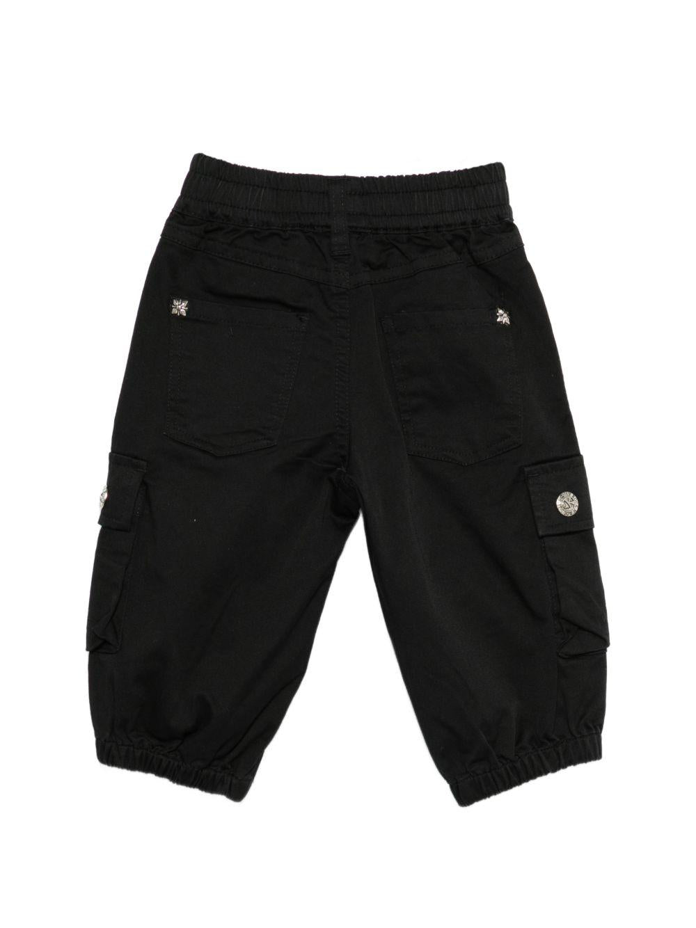 The John Richmond Junior black cargo pocket trousers for babies are available on the RubinoKids.com online store. Made from 100% cotton, they feature a black color, an elastic waistband, buttoned cuffs, side pockets, cargo pockets, and buttoned details. Available in various sizes, they are part of the John Richmond Junior Spring/Summer 2026 collection and are available for 24-48 hour delivery in Italy.