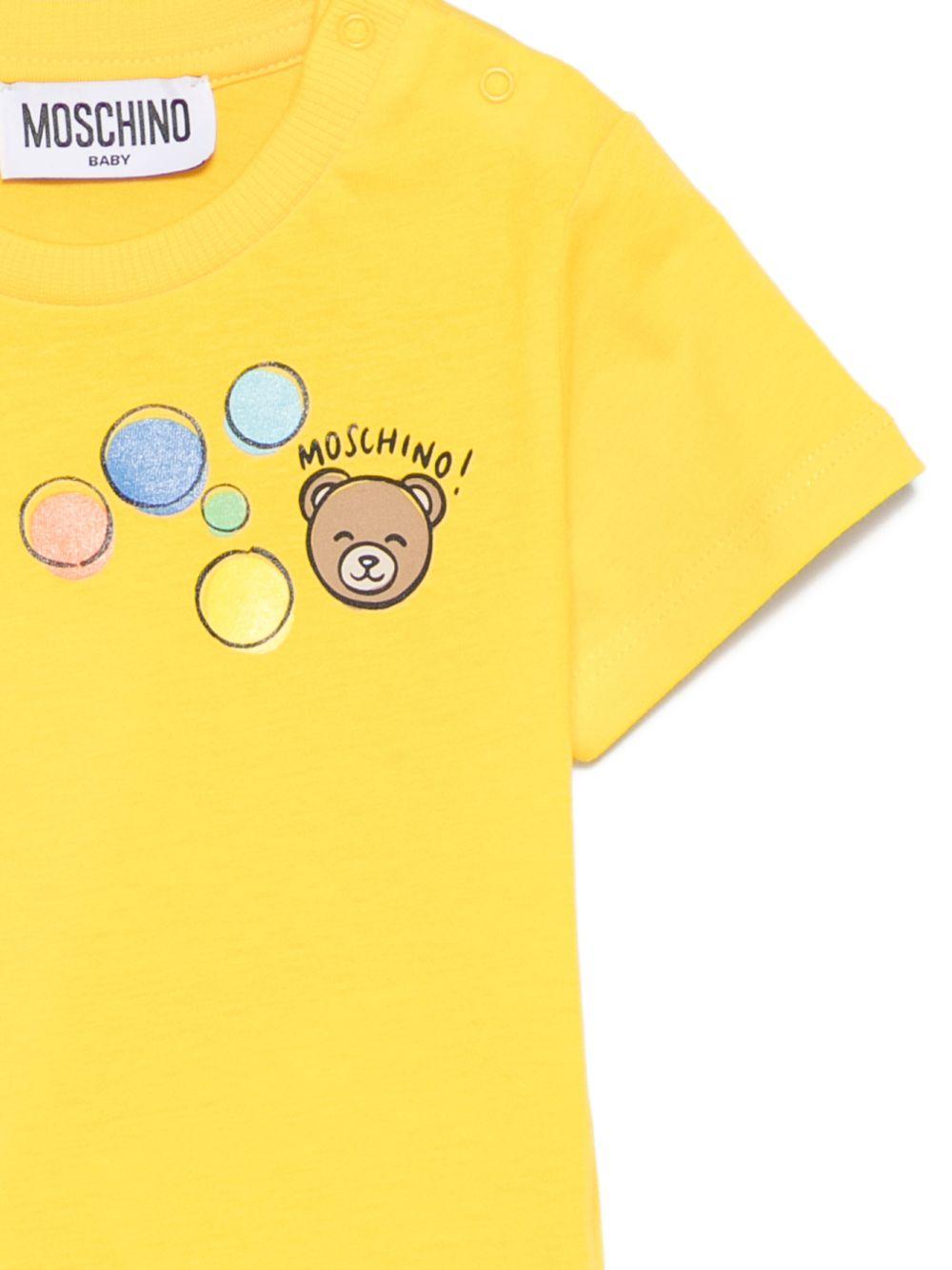 The yellow Moschino Kids graphic print T-shirt for babies is available on the RubinoKids.com online store. Made of 100% cotton, it features a yellow color, short sleeves, a crew neck, and a straight hem. Available in various sizes, it is part of the Moschino Kids Spring/Summer 2026 collection and is available for 24-48 hour delivery in Italy.