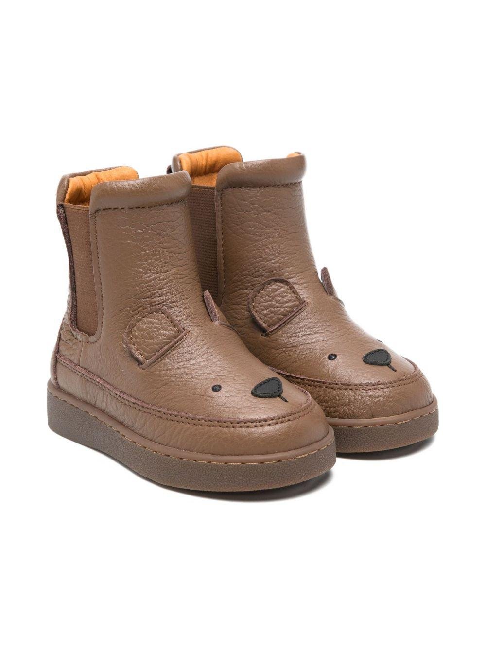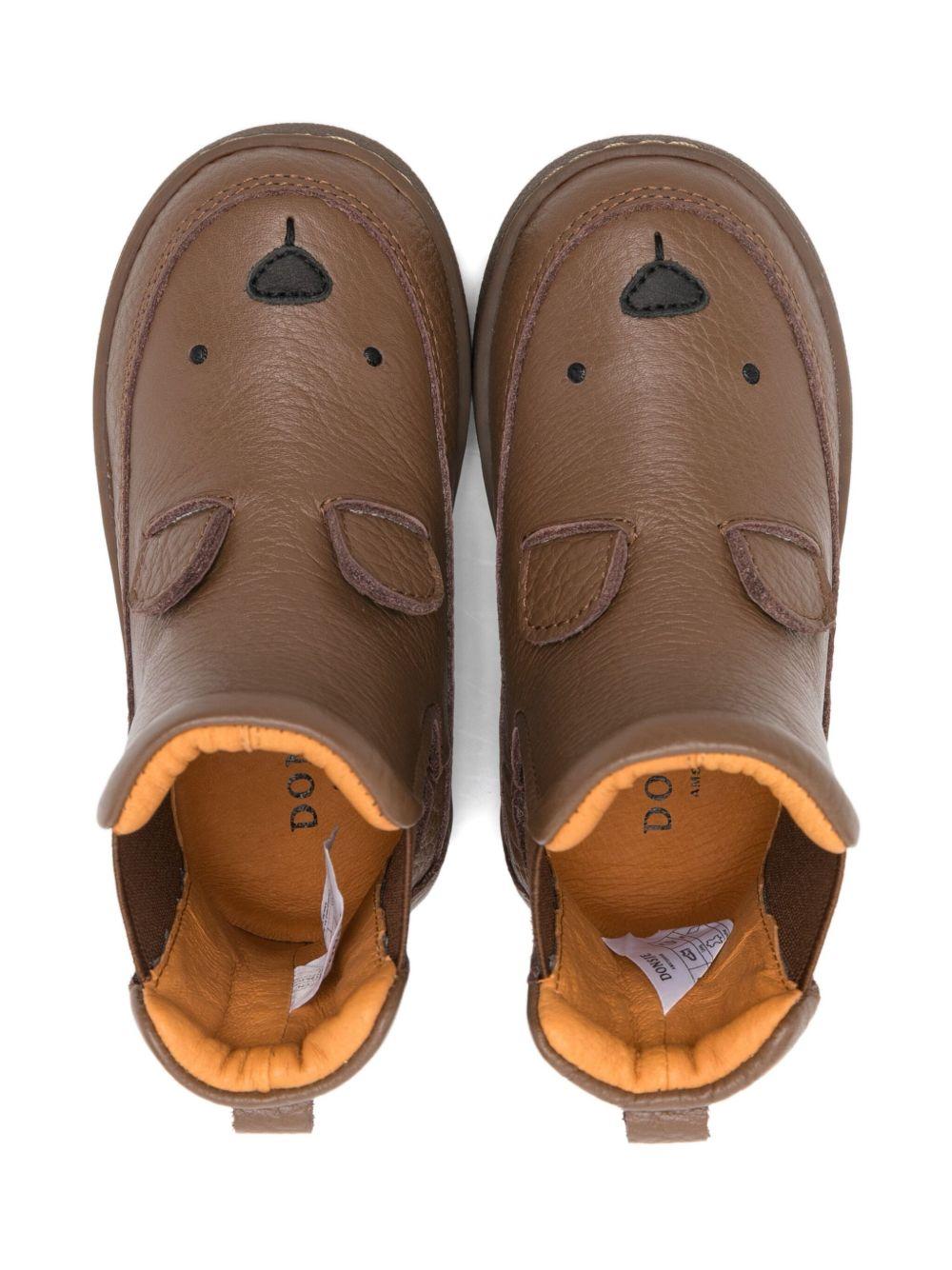 Il prodotto Stivali per neonato Donsje marroni con motivo con faccia d'orso è disponibile sullo store online RubinoKids.com. Realizzato in pelle 100%. Il prodotto presenta un colore marrone, disegno muso orso in pelli, pannelli laterali elastici, punta tonda, suola piatta. Varie taglie a catalogo, appartiene alla collezione Donsje Autunno/ Inverno 2025 ed è disponibile con consegna in 24/48h per l'Italia.