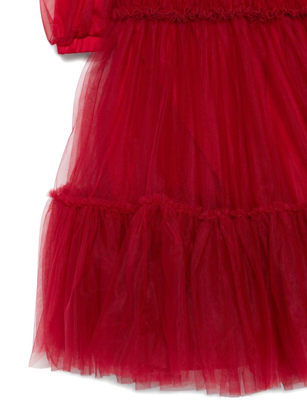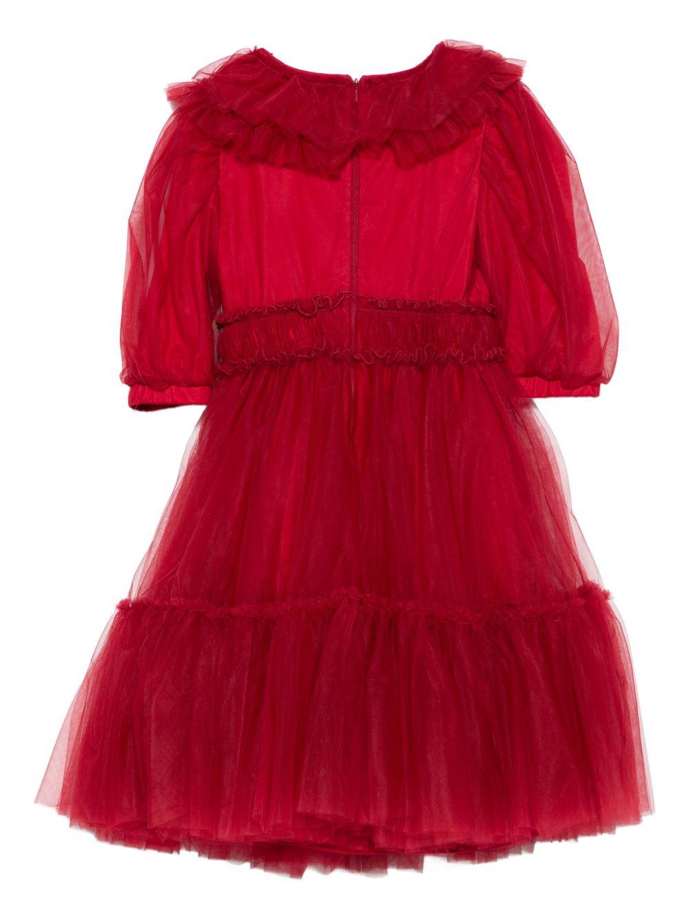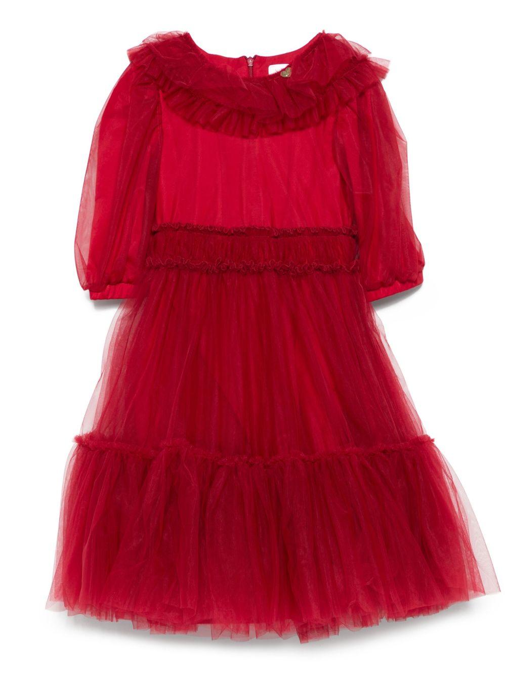 The Monnalisa red dress for girls with layered ruffles is available on the RubinoKids.com online store. Made of 100% polyamide, it features a red color, layered ruffles, puff sleeves, a round neckline, a zipper closure, and tulle lining. Available in various sizes, it is part of the Monnalisa Fall/Winter 2025 collection and is available for 24-48 hour delivery in Italy.