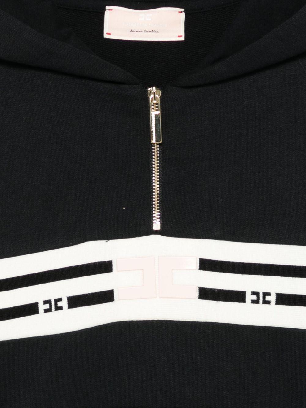 The Elisabetta Franchi La Mia Bambina black zip-up hoodie for girls is available on the RubinoKids.com online store. Made from 100% cotton, 51% viscose, 31% polyester, and 18% polyamide, it features a black half-zip, ribbed cuffs, a logo detail, a horizontal stripe print, and a hooded collar. Available in various sizes, it is part of the Elisabetta Franchi La Mia Bambina Fall/Winter 2025 collection and is available for immediate shipment with delivery within 24-48 hours in Italy.
