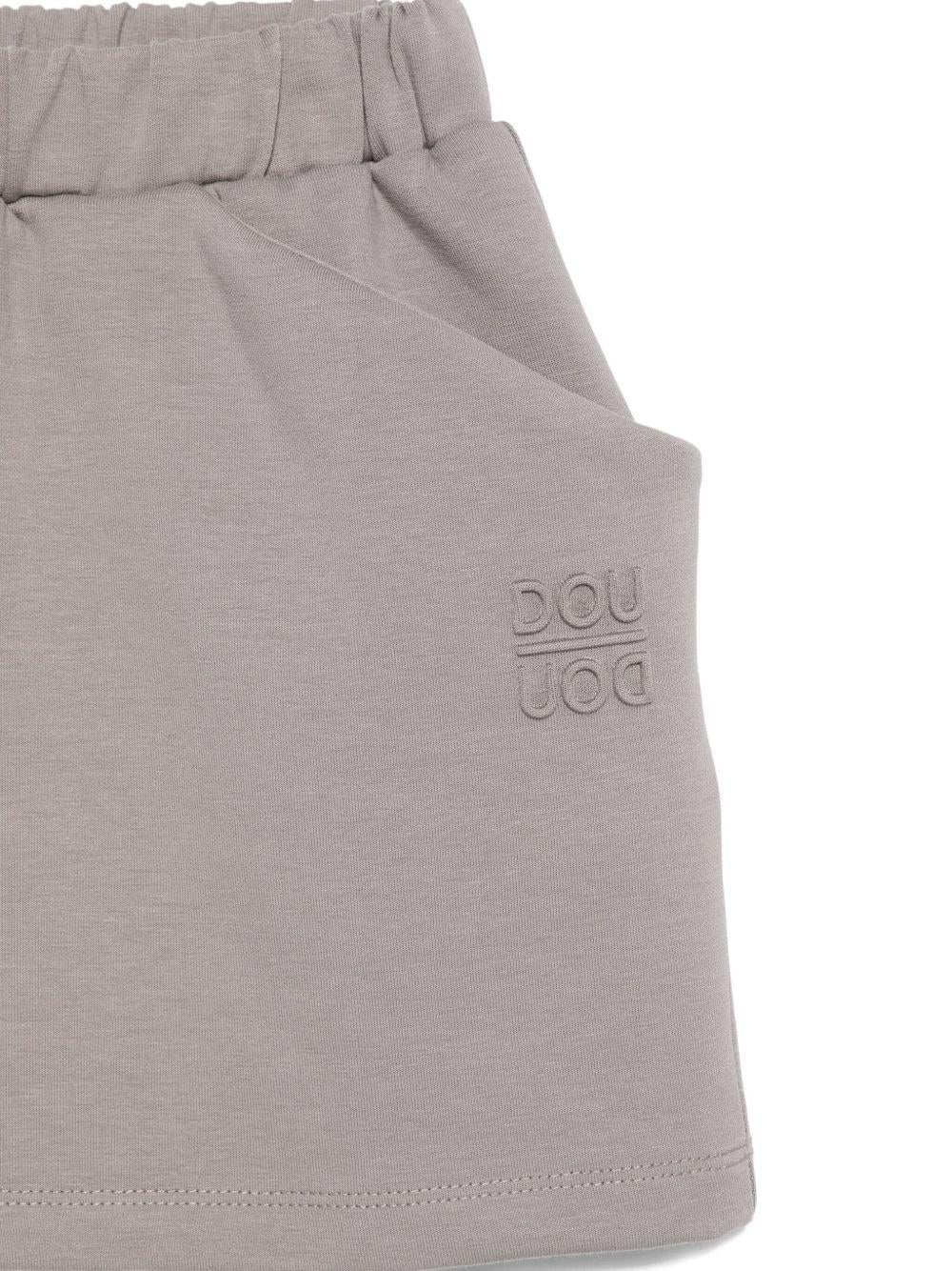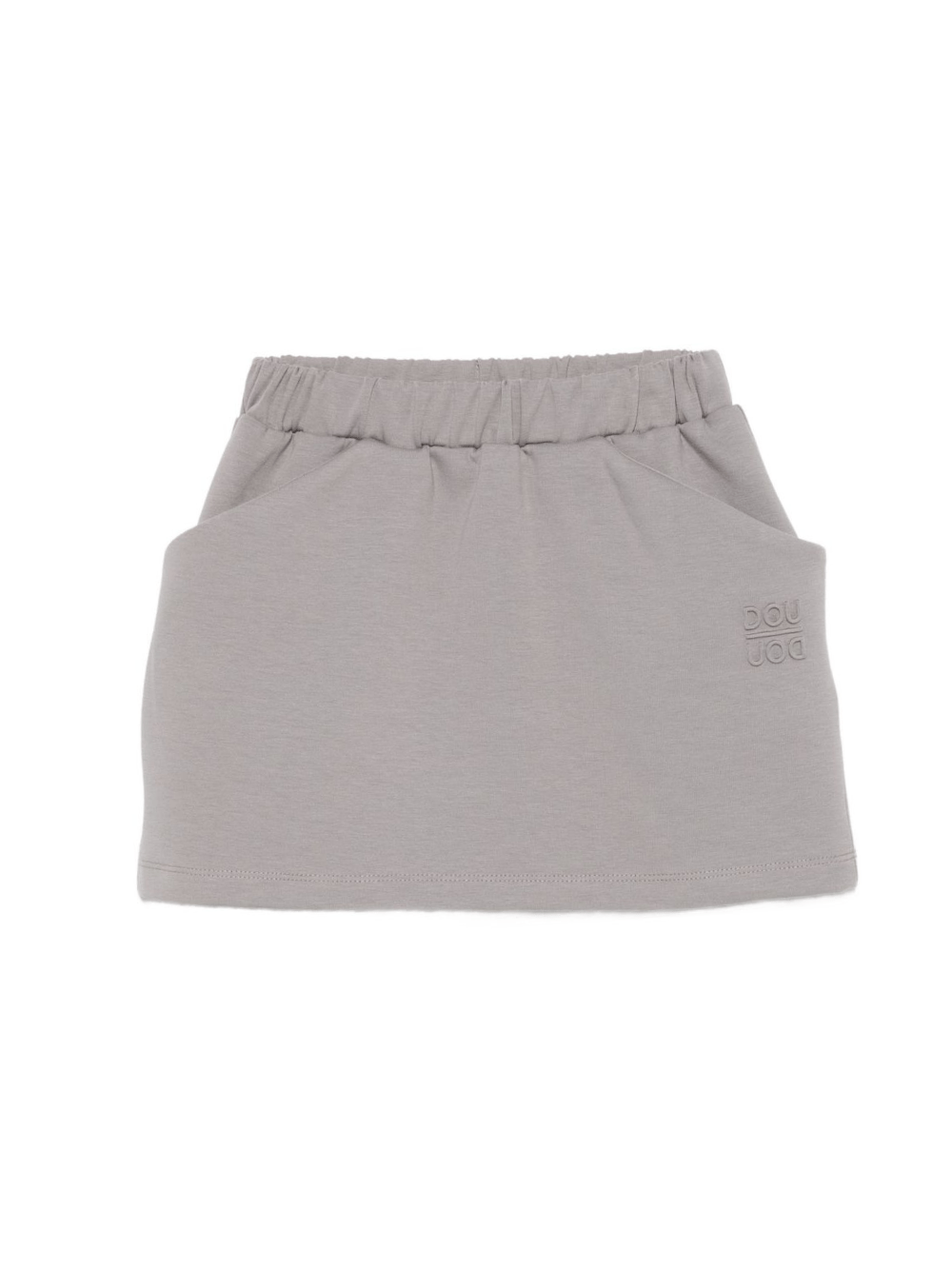 The Douuod Kids gray skirt for girls with two side pockets is available on the RubinoKids.com online store. Made of 79% cotton, 17% polyester, and 4% elastane, it features a gray color, an elastic waistband, two side pockets, an embossed logo, a straight hem, and jersey fabric. Available in various sizes, it is part of the Douuod Kids Fall/Winter 2025 collection and is available for 24-48 hour delivery in Italy.