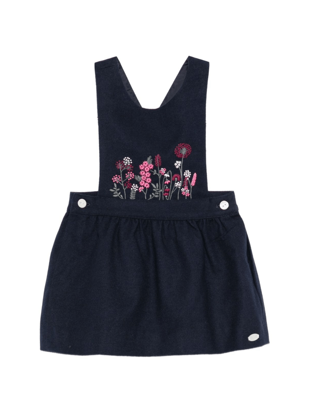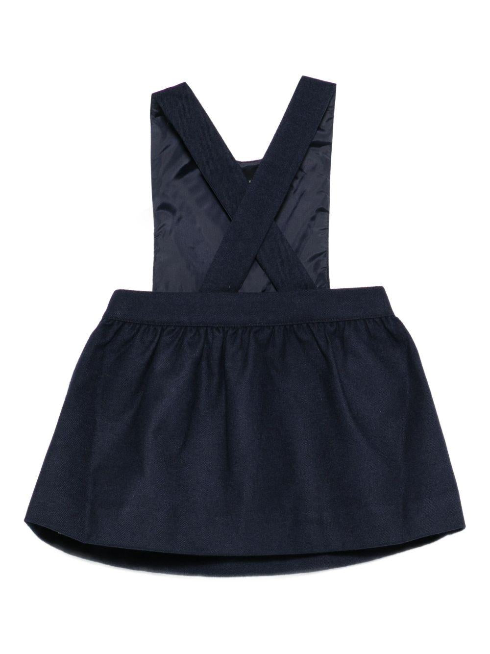 The Tartine Et Chocolate baby girl's dress in blue with floral embroidery is available on the RubinoKids.com online store. Made of 100% fabric, it features a blue color, a gathered skirt, floral embroidery, crossed shoulder straps at the back, a button closure, and an A-line shape. Available in various sizes, it is part of the Tartine Et Chocolate Fall/Winter 2025 collection and is available for 24-48 hour delivery in Italy.
