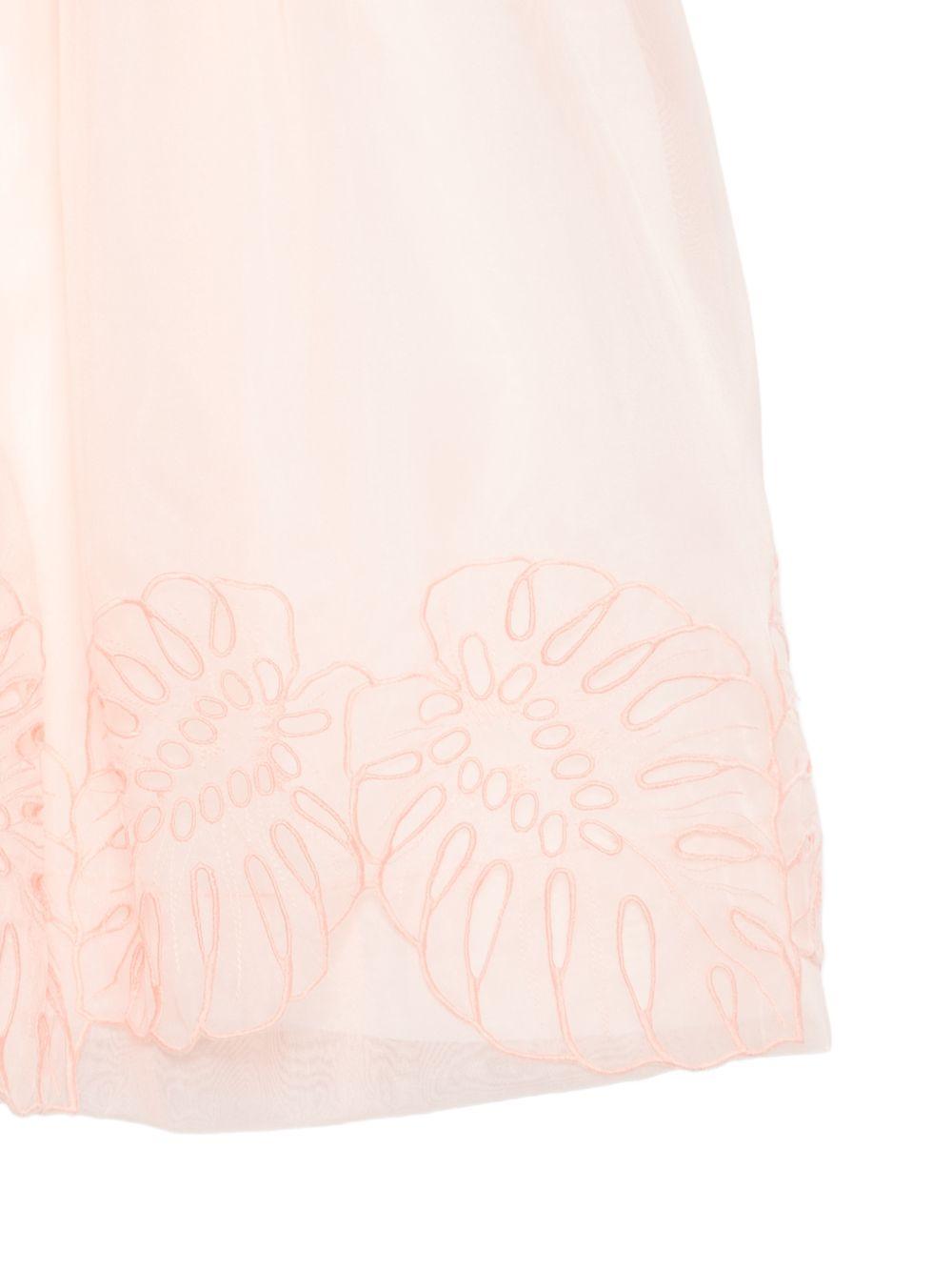 The Mi Mi Sol pink dress for girls with ruffles and embroidery is available on the RubinoKids.com online store. Made of 100% cotton, it features a salty pink color, floral embroidery, ruffled detail, bow detail, cap sleeves, and a back zip closure. Available in various sizes, it is part of the Mi Mi Sol Spring/Summer 2026 collection and is available for 24-48 hour delivery in Italy.