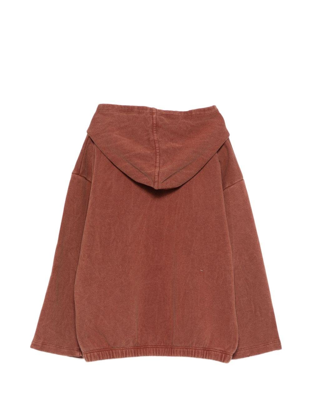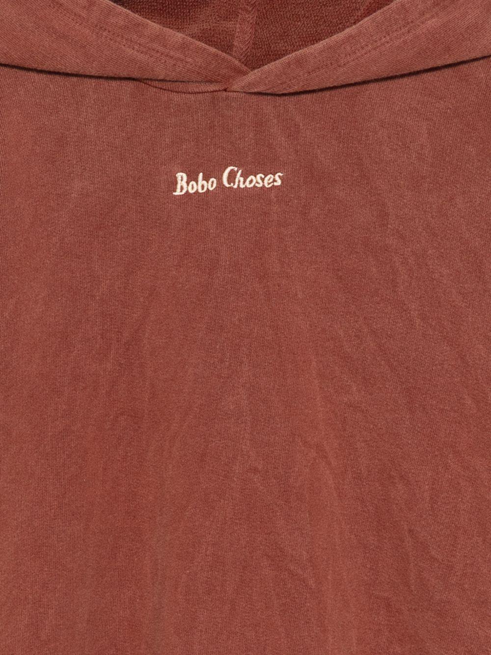 The brown Bobo Choses sweatshirt for boys with front logo is available on the RubinoKids.com online store. Made from 66% organic cotton, 17% recycled cotton, and 17% cotton, it features a brown hood, front logo, long sleeves, and an elasticated hem. Available in various sizes, it is part of the Bobo Choses Spring/Summer 2026 collection and is available for 24-48 hour delivery in Italy.
