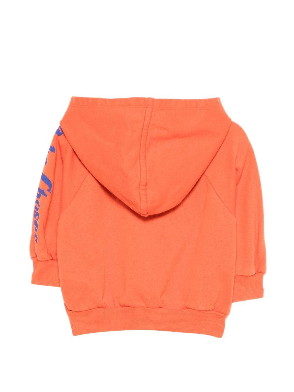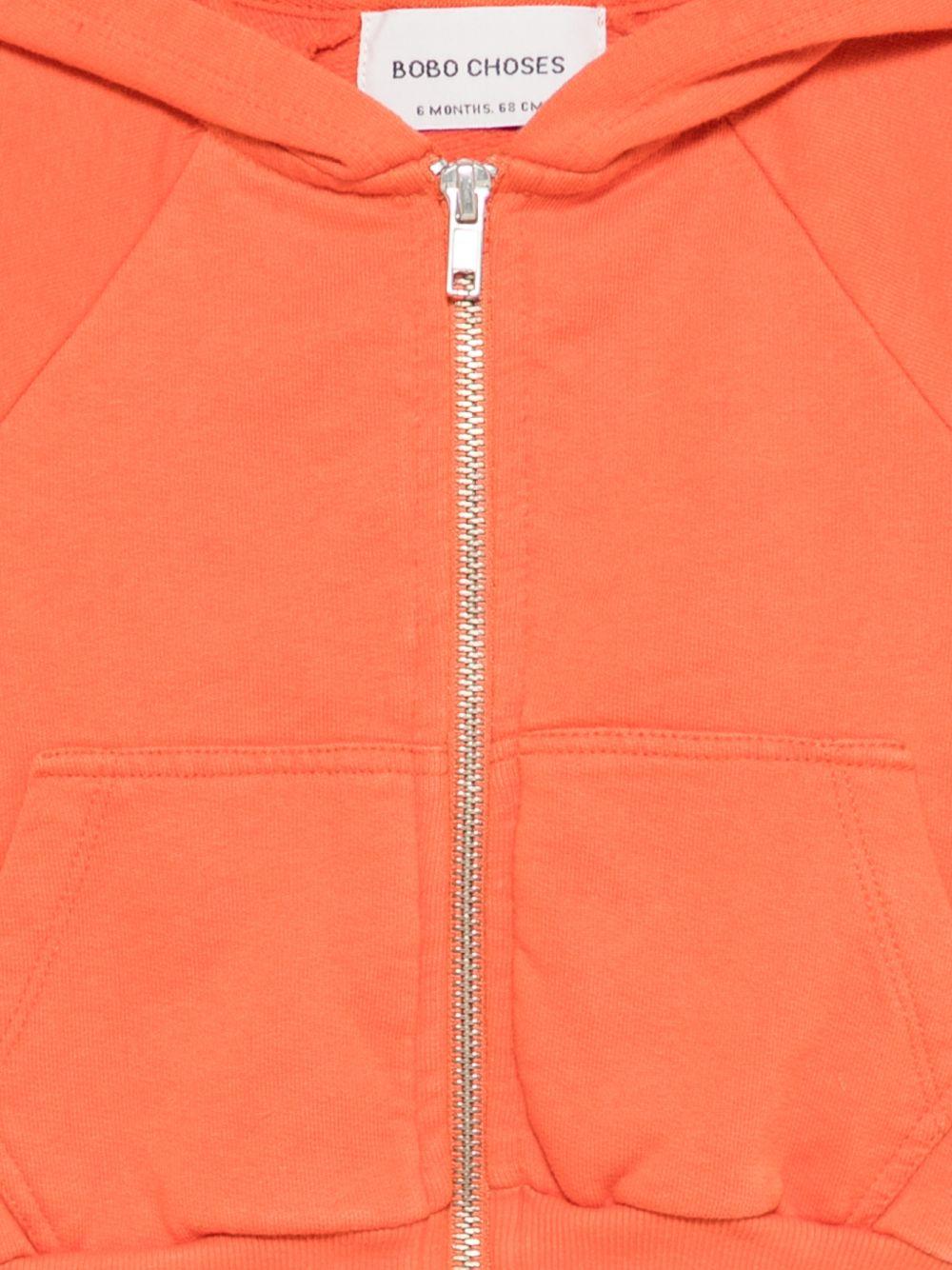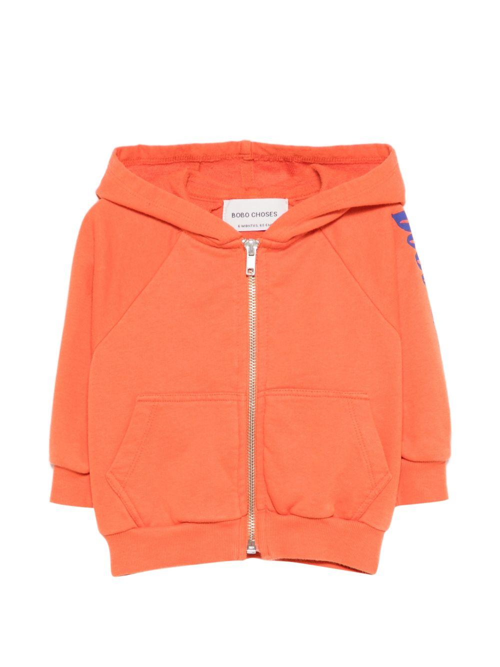 The Bobo Choses orange baby sweatshirt with contrasting sleeve logo is available on the RubinoKids.com online store. Made of 100% cotton, it features an orange color, a contrasting sleeve logo, a hood, a zip closure, front kangaroo pockets, and long sleeves. Available in various sizes, it is part of the Bobo Choses Spring/Summer 2026 collection and is available for 24-48 hour delivery in Italy.