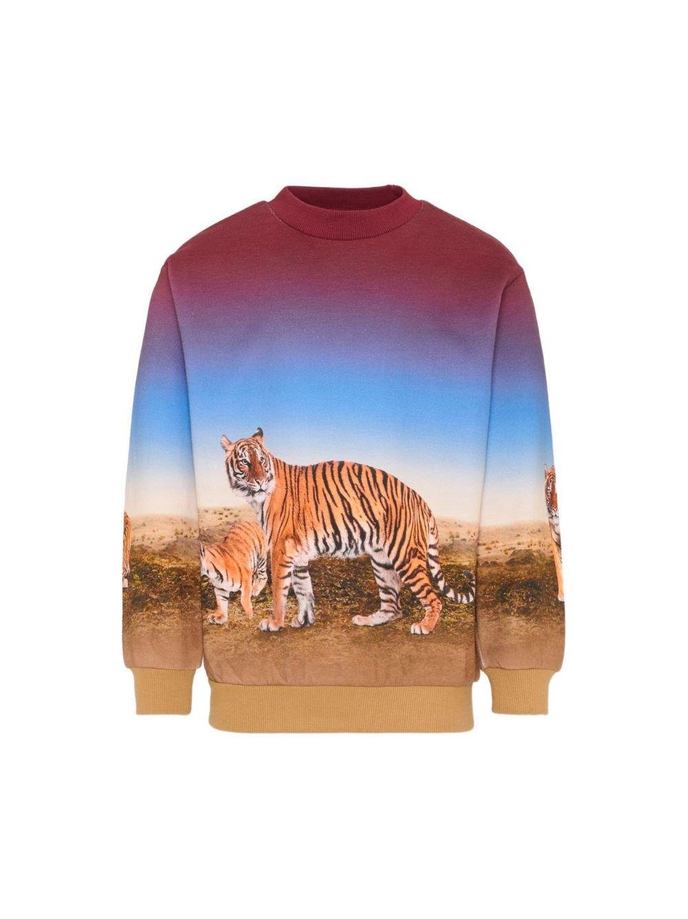 The Molo multicolored Mixi sweatshirt for boys with tiger print is available on the RubinoKids.com online store. Made of 100% cotton, it features a multicolored tiger print, a ribbed crew neck, hem, and cuffs. Available in various sizes, it is part of the Molo Spring/Summer 2026 collection and is available for delivery in Italy within 24-48 hours.