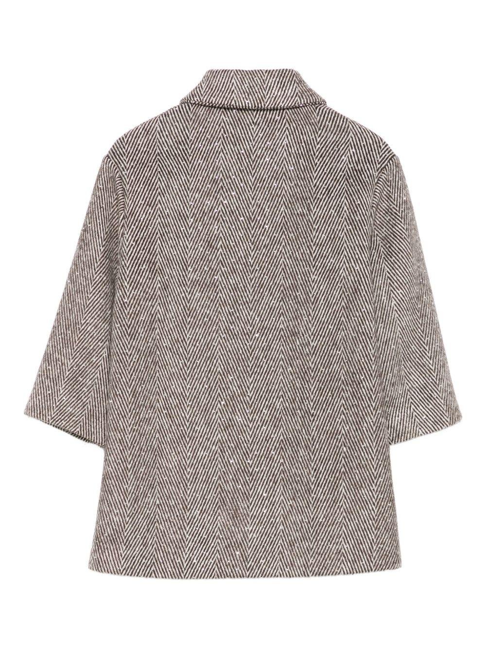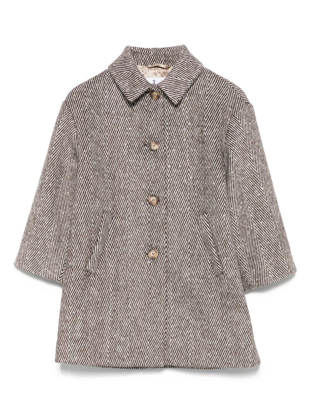The Il Gufo brown herringbone jacket for girls is available on the RubinoKids.com online store. Made of 90% polyester and 10% wool, it features a brown herringbone pattern, button closure, long sleeves, side pockets with vents, and a classic collar.