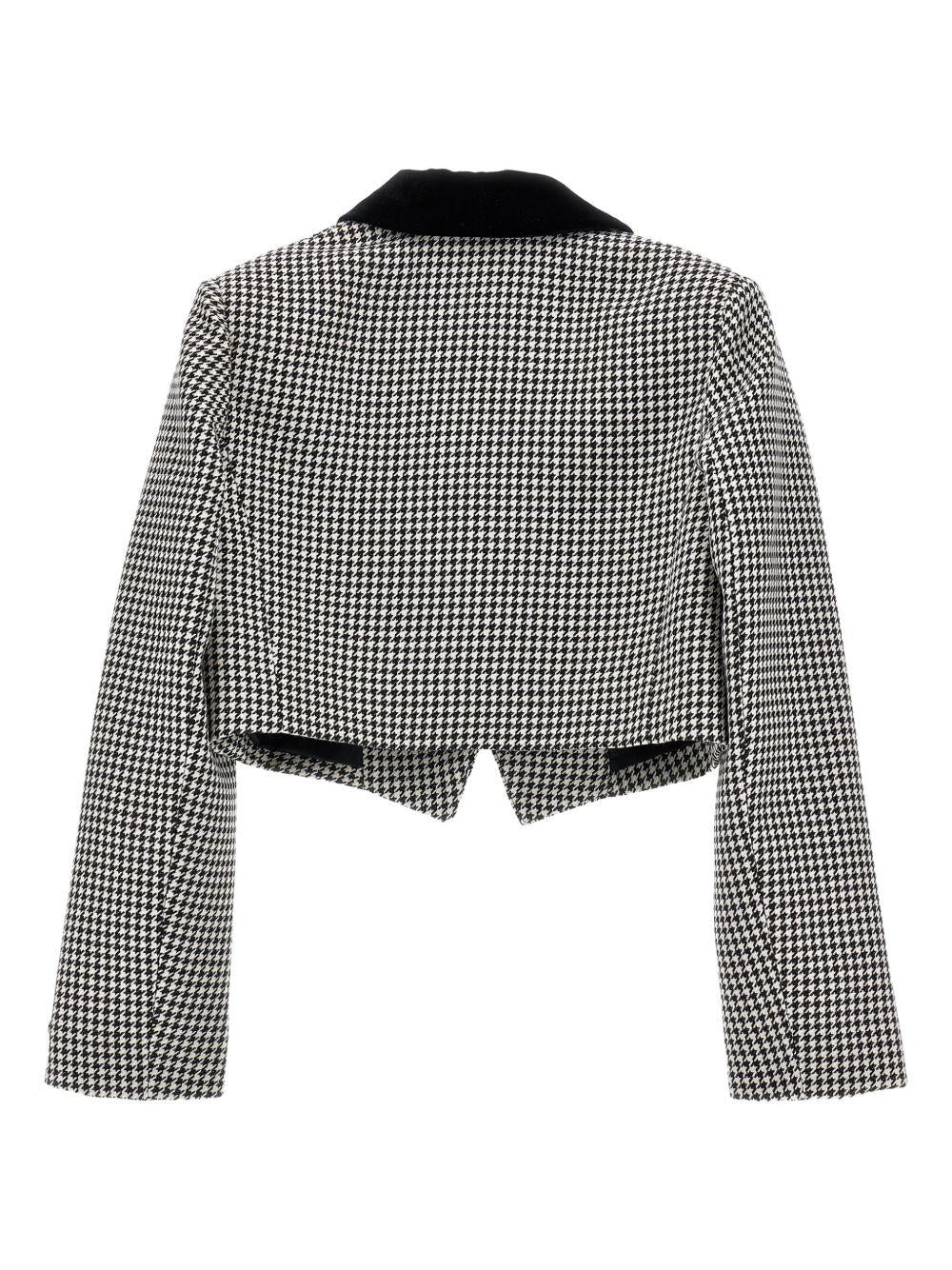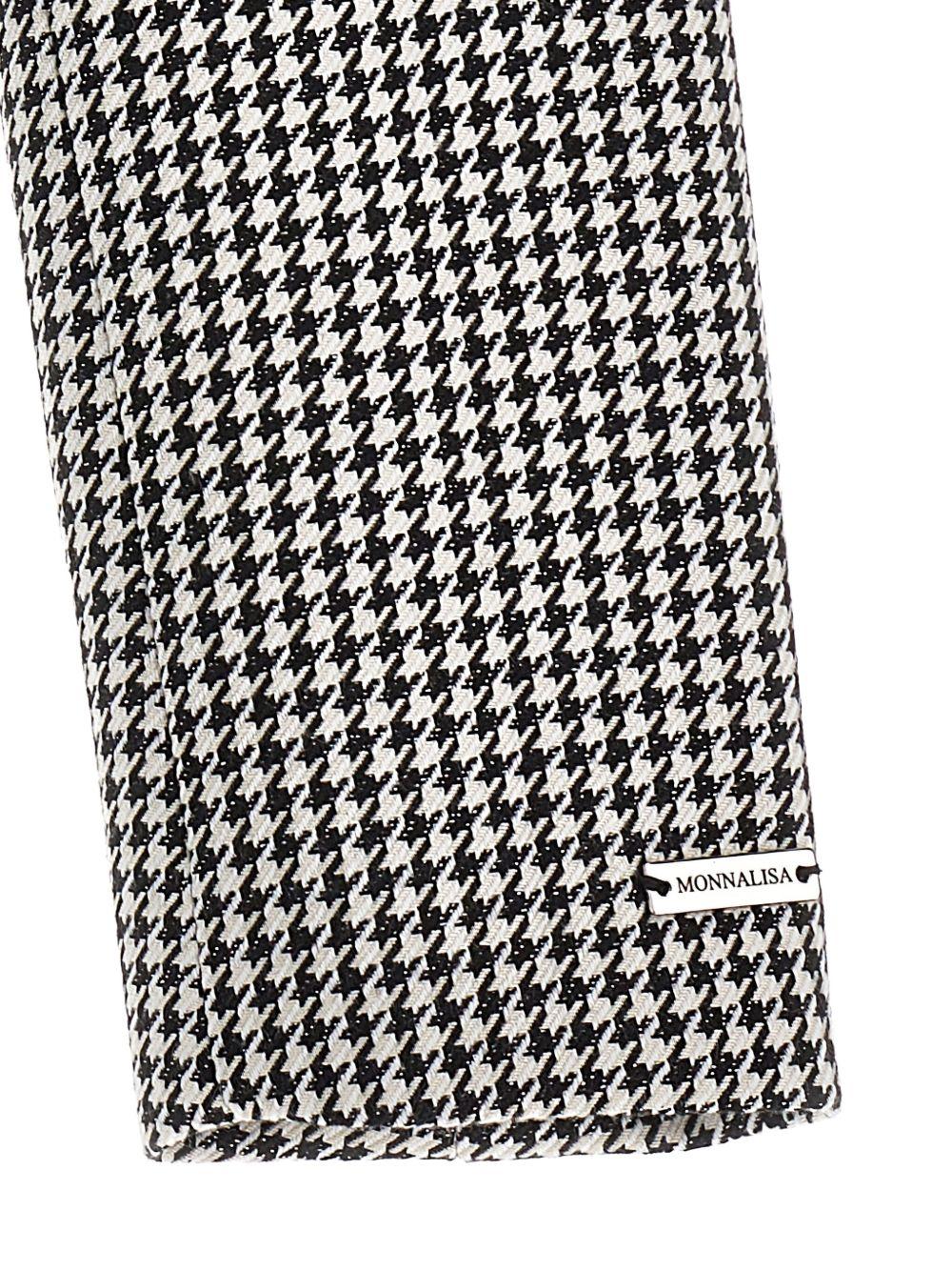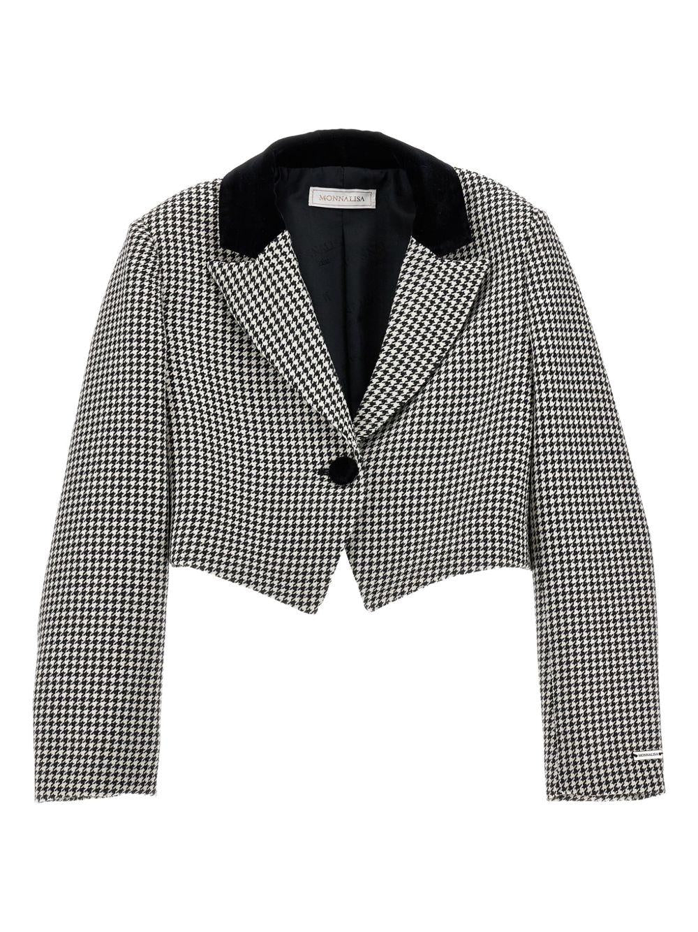 The Monnalisa girls' black checked jacket is available on the RubinoKids.com online store. Made of 100% fabric, it features a black color, a front button closure, peaked lapels, a curved hem, and a cropped design. Available in various sizes, it is part of the Monnalisa Fall/Winter 2025 collection and is available for immediate shipment with delivery within 24-48 hours in Italy.