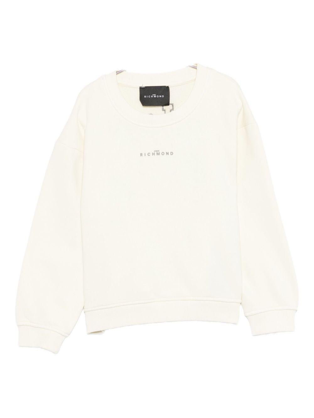 The John Richmond Junior white sweatshirt for boys with logo print is available on the RubinoKids.com online store. Made of 100% cotton, it features a white logo print, ribbed trims, a round neck, and long sleeves. Available in various sizes, it is part of the John Richmond Junior Fall/Winter 2025 collection and is available for 24-48 hour delivery in Italy.