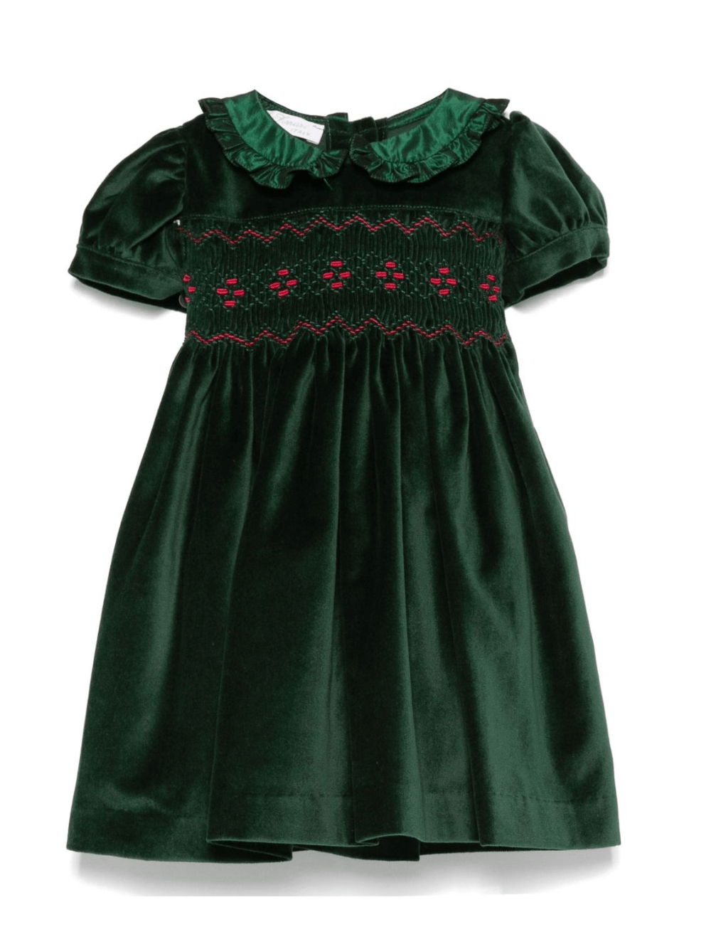 The Mariella Ferrari green velvet dress for baby girls is available on the RubinoKids.com online store. Made of 100% cotton, it features a green velvet design, short puff sleeves, and red embroidery. Available in various sizes, it is part of the Mariella Ferrari Fall/Winter 2025 collection and is available for immediate shipment with delivery within 24-48 hours in Italy.