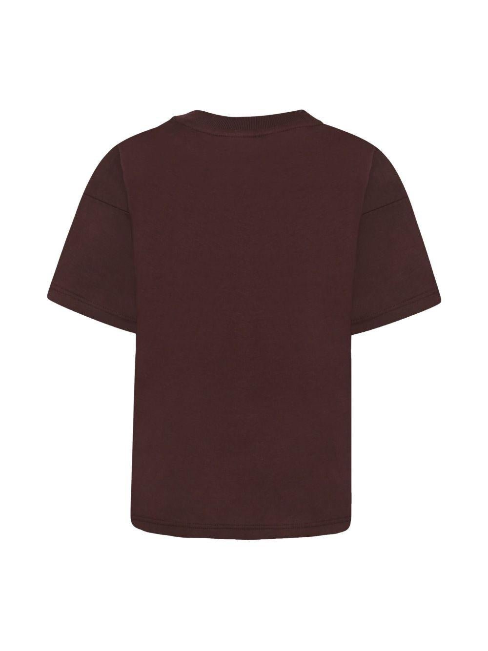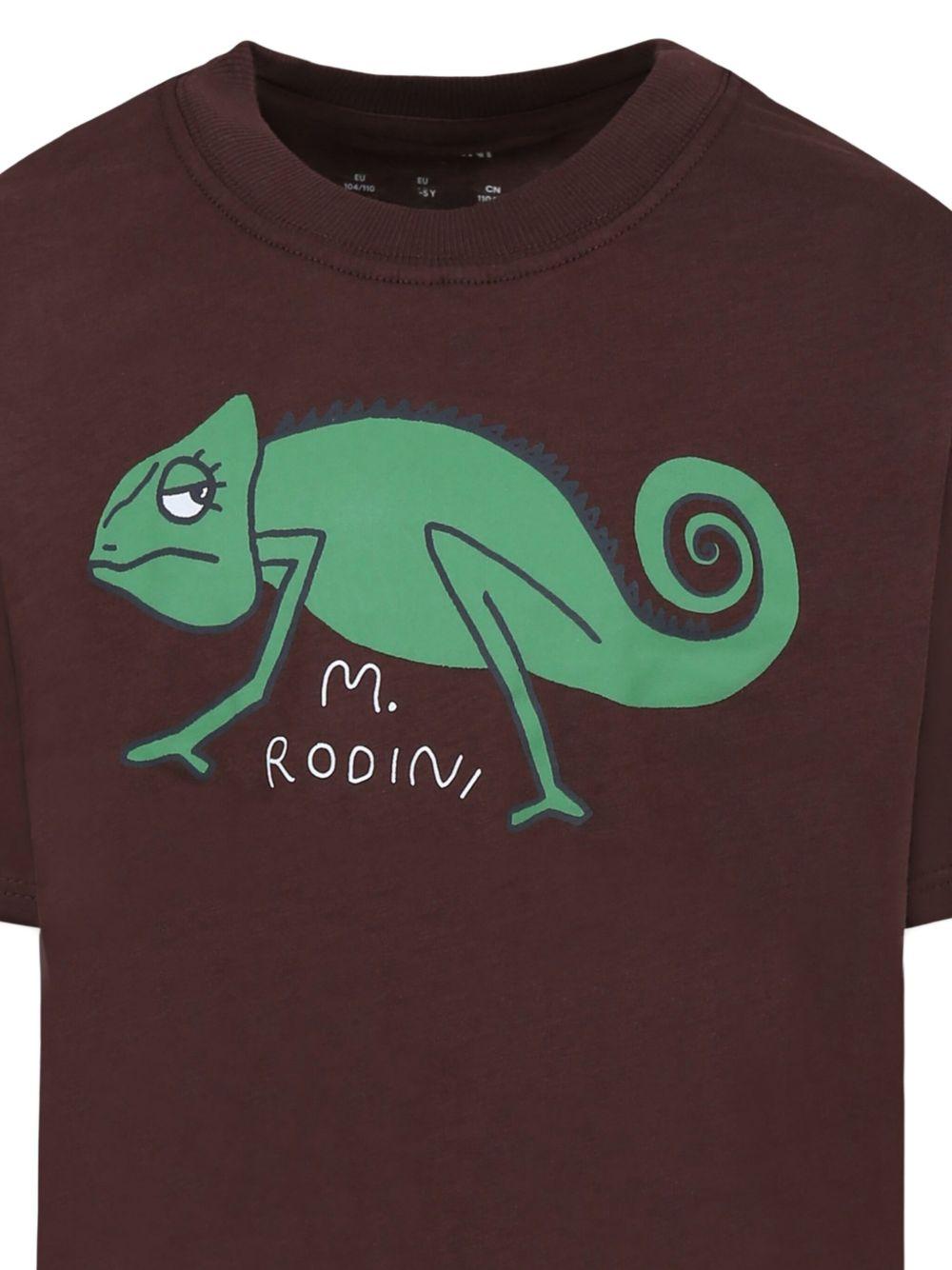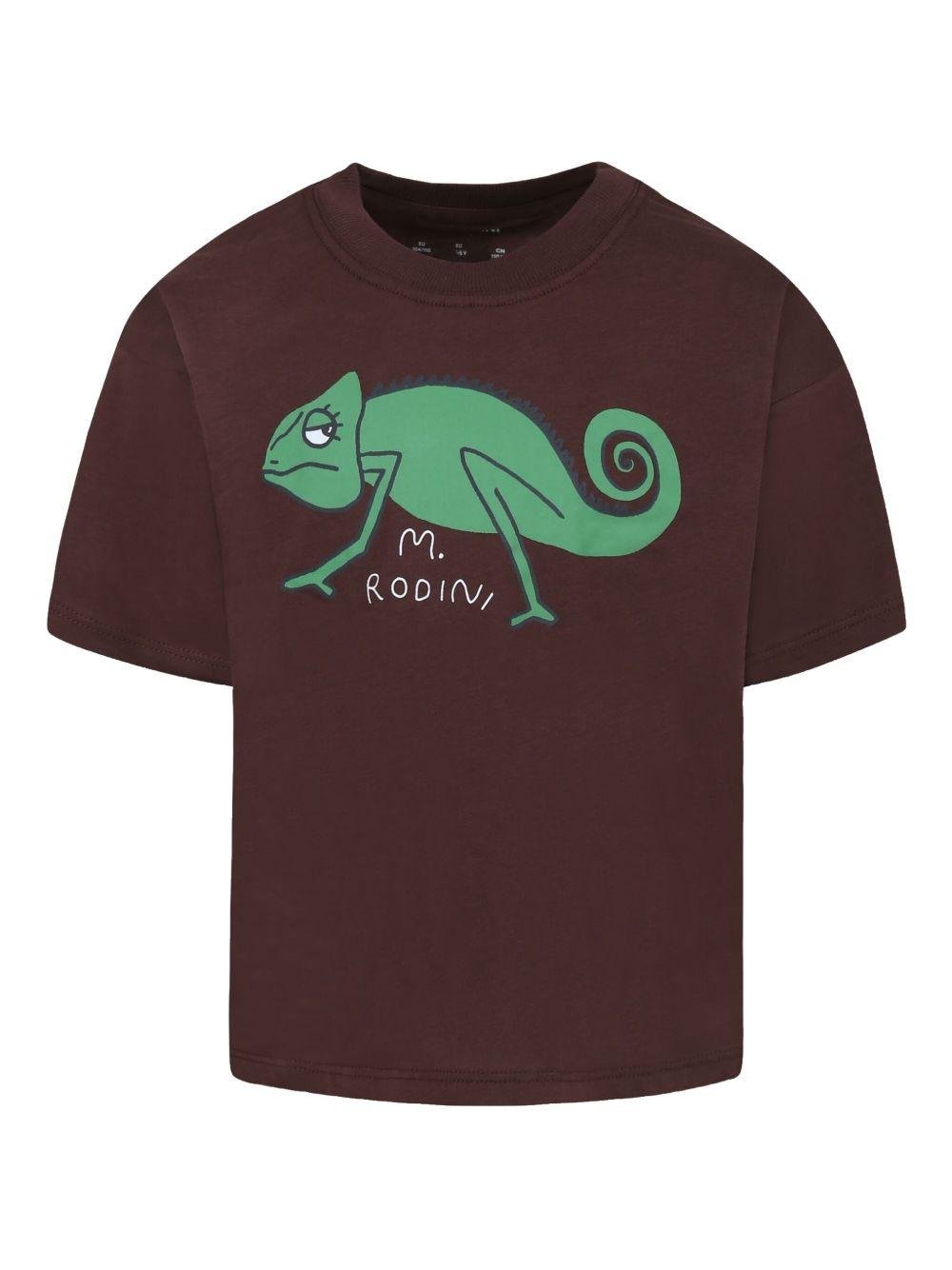 The Mini Rodini brown lizard-print T-shirt for boys with a round neck is available on the RubinoKids.com online store. Made of 100% cotton, it features a dark brown logo print on the front, a graphic print on the front, and short sleeves. This size is part of the Mini Rodini Spring/Summer 2025 collection and is available for immediate shipment with delivery within 24-48 hours in Italy.