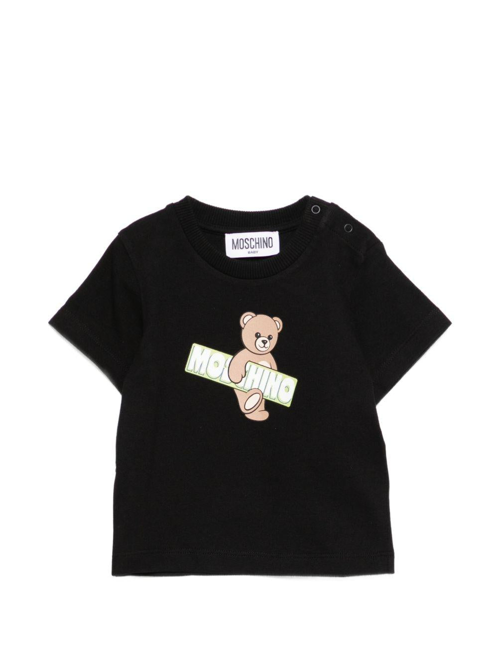 The Moschino Kids black baby T-shirt with Teddy Bear print is available on the RubinoKids.com online store. Made of 100% cotton, it features a black Teddy Bear print on the front, a logo on the front, short sleeves, a crew neck, and snap button closure. Available in various sizes, it is part of the Moschino Kids Spring/Summer 2026 collection and is available with 24-48 hour delivery in Italy.