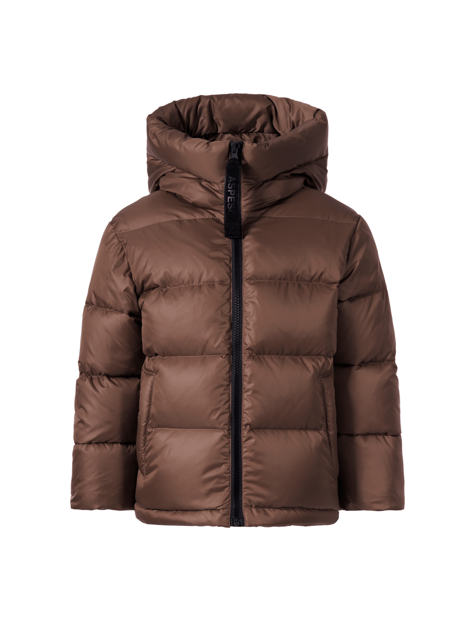 The Aspesi Kids brown quilted jacket for boys is available on the RubinoKids.com online store. Made of 100% polyamide, it features a brown color, a quilted design, a hood, a high collar, side pockets, a zip closure, and elastic cuffs. Available in various sizes, it is part of the Aspesi Kids Fall/Winter 2025 collection and is available for 24-48 hour delivery in Italy.