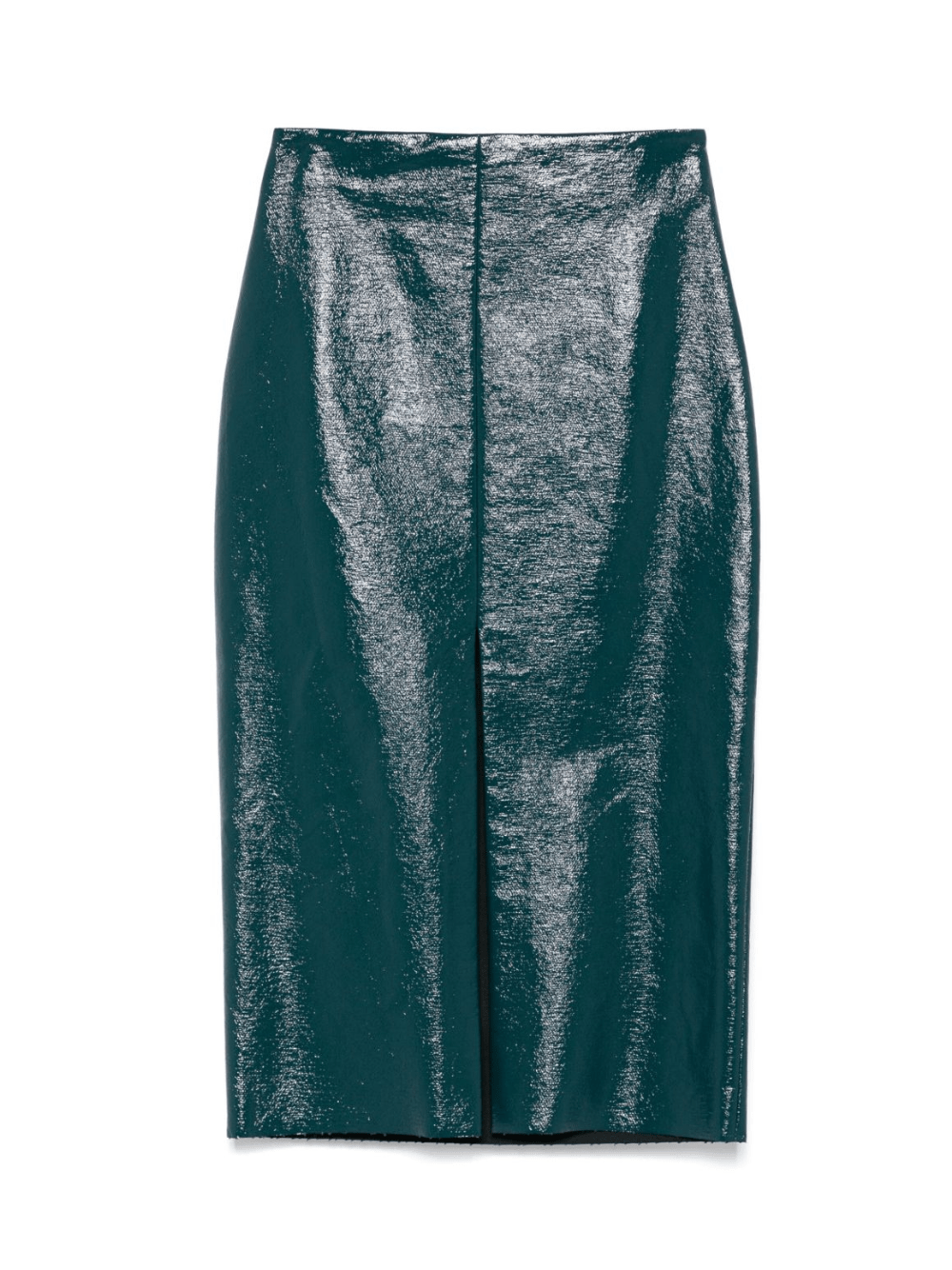 The THE M Nada green midi skirt for women with front slit is available on the RubinoKids.com online store. Made of 100% cotton, it features a teal color, a hidden side zip closure, a front slit, and a straight hem. Available in various sizes, it is part of the THE M Spring/Summer 2025 collection and is available for immediate shipment with delivery within 24-48 hours in Italy.