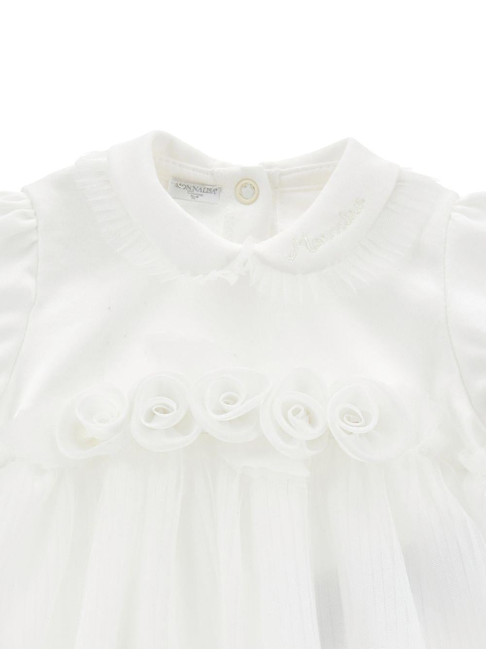 The Monnalisa white baby girl dress with pink detail is available on the RubinoKids.com online store. Made of 100% cotton, it features a white color, a pink detail, a tulle hem, short sleeves, a button closure, and a pleated skirt. Available in various sizes, it is part of the Monnalisa 24/48h collection for Italy.