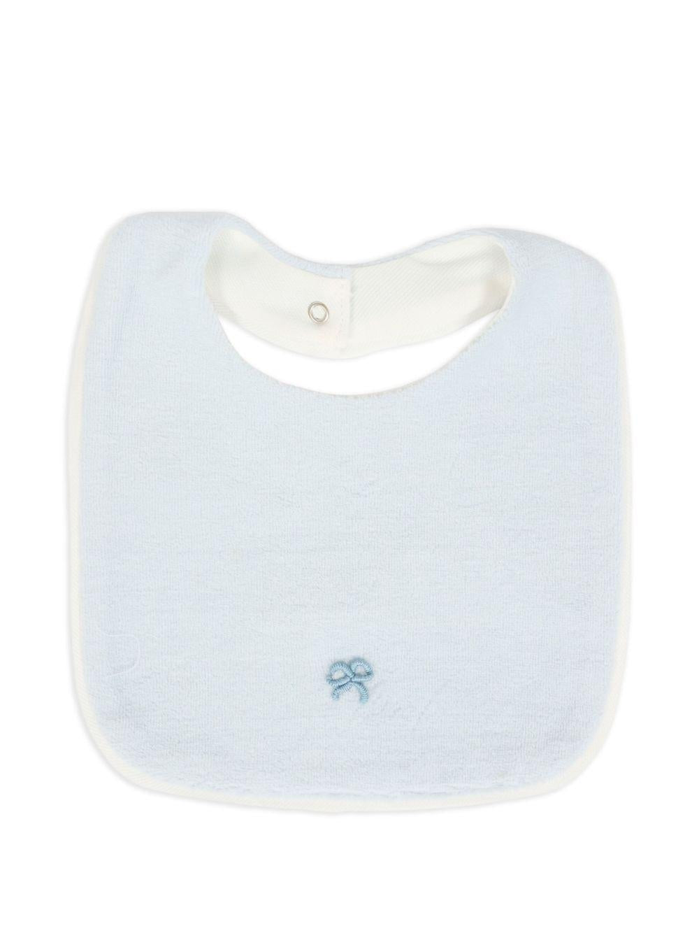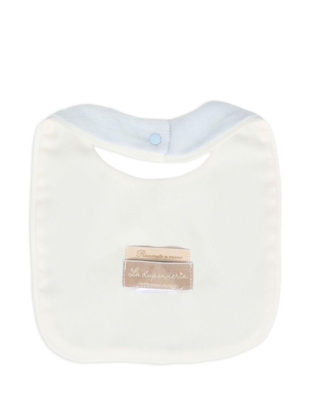 The La Stupenderia baby bib in light blue with embroidered detail is available on the RubinoKids.com online store. Made of 80% cotton and 20% polyester, it features a light blue color, embroidered detail, a ribbed weave, and a white trim. It is part of the La Stupenderia Fall/Winter 2025 collection and is available for 24-48 hour delivery in Italy.