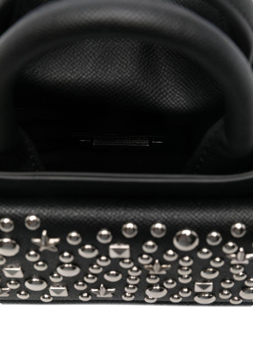 The John Richmond Junior black studded shoulder bag for girls is available on the RubinoKids.com online store. Made of 100% calfskin, it features black top handles, stud embellishments, a detachable shoulder strap, and a logo detail. It is part of the John Richmond Junior Fall/Winter 2025 collection and is available for immediate shipment with delivery within 24-48 hours in Italy.