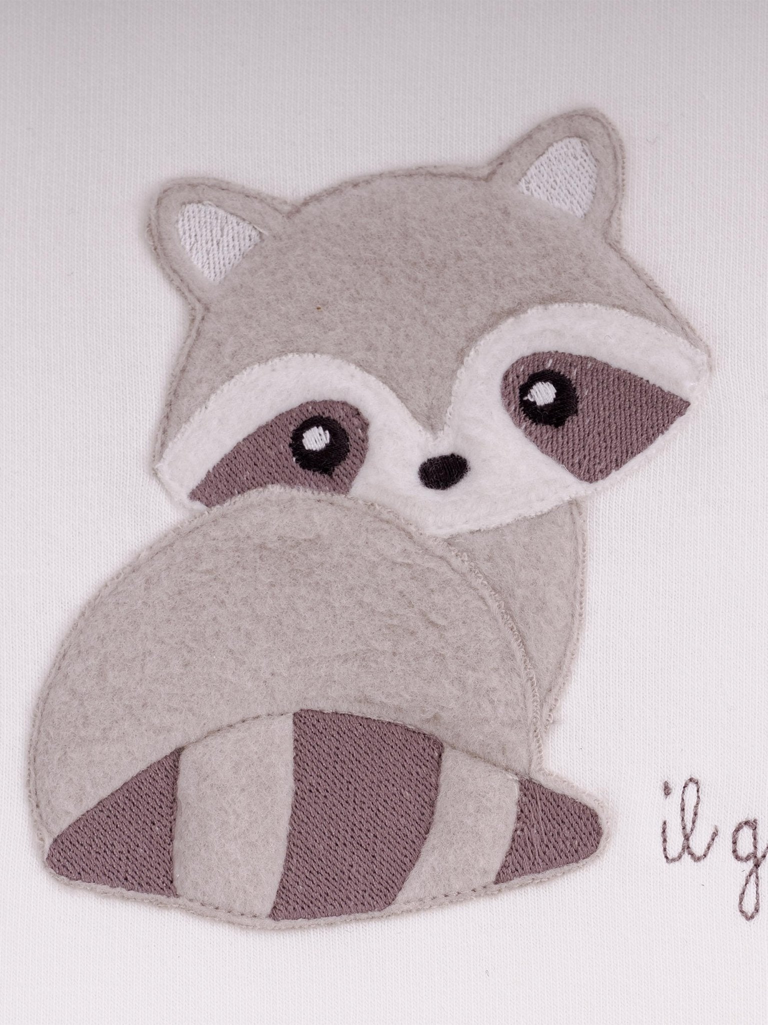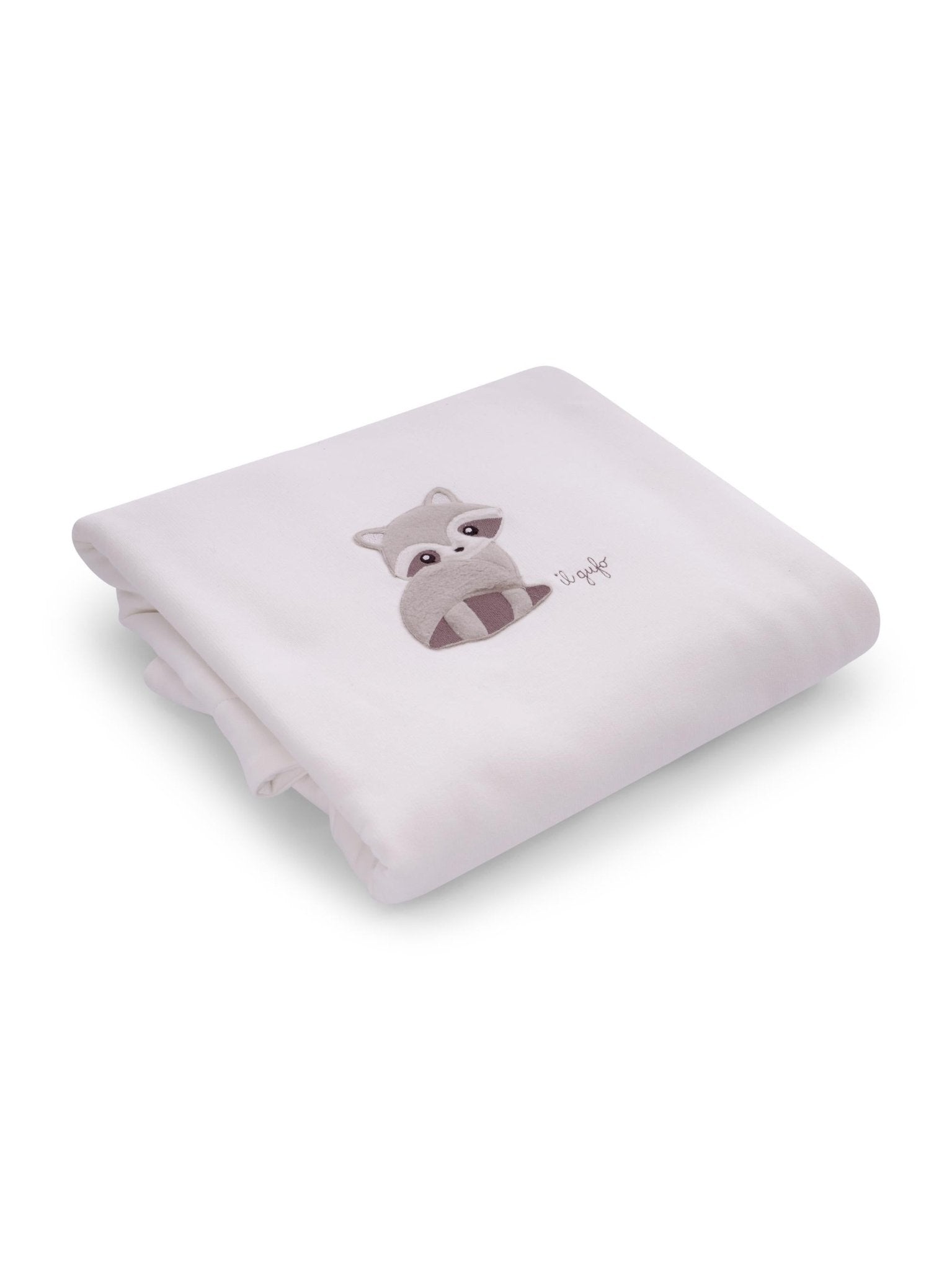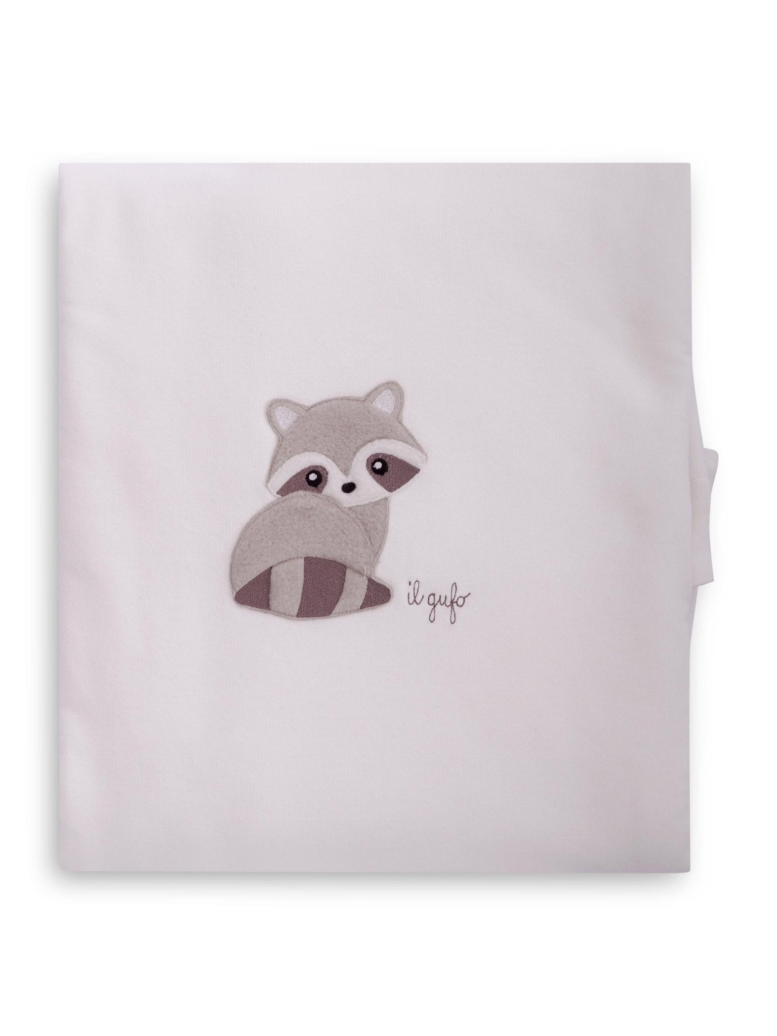 White Il Gufo baby blanket with raccoon embroidery on the front