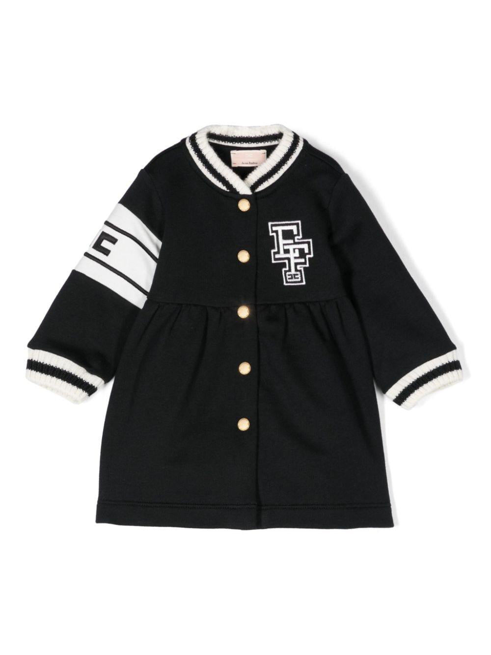 The Elisabetta Franchi La Mia Bambina black embroidered dress for newborns with a ribbed collar is available on the online store RubinoKids.com. Made of 100% merino wool, 100% cotton. The product features a jersey weave, a logo on the chest, a front snap closure, a ribbed collar, long sleeves, a logo on the sleeve, ribbed edges, a terry cloth fabric, and a flared hem. This size is part of the Elisabetta Franchi La Mia Bambina Fall/Winter 2024 collection and is available for immediate shipment with delivery within 24-48 hours in Italy.