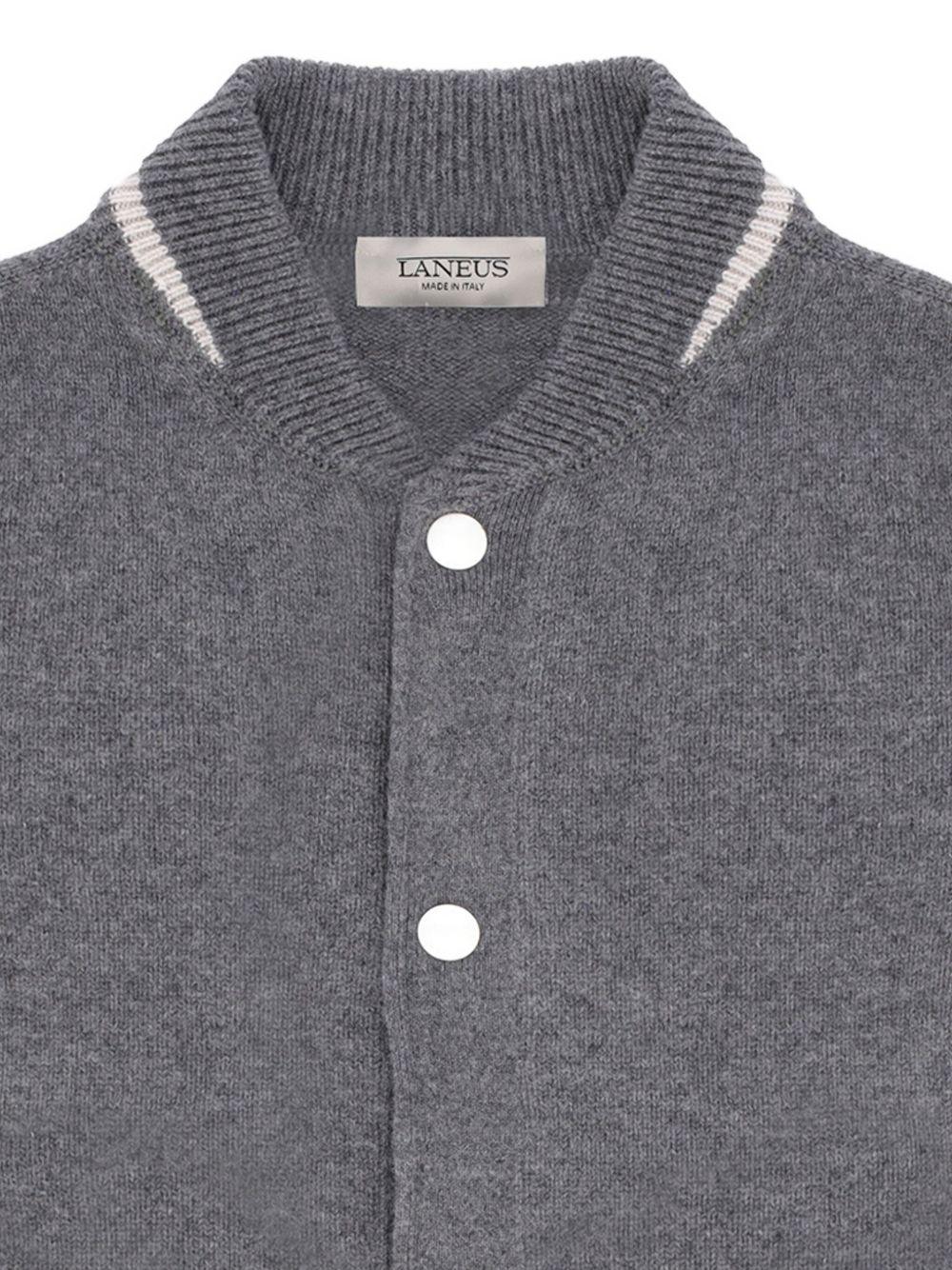 The Laneus Kids gray jacket with side pockets is available on the RubinoKids.com online store. Made from 55% merino wool, 30% silk, and 15% cashmere, it features a gray knit, button closure, ribbed hem, and side pockets. Available in various sizes, it is part of the Laneus Kids Fall/Winter 2025 collection and is available for 24-48 hour delivery in Italy.