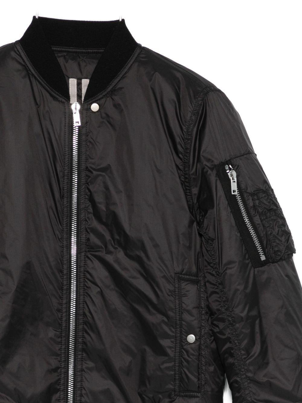 The Rick Owens Kids black ribbed jacket for boys is available on the RubinoKids.com online store. Made of 100% nylon, it features a black color, a zip closure, ribbed trims, a zippered sleeve pocket, snap-button pockets, and a padded design. Available in various sizes, it is part of the Rick Owens Kids Fall/Winter 2025 collection and is available with 24-48 hour delivery in Italy.
