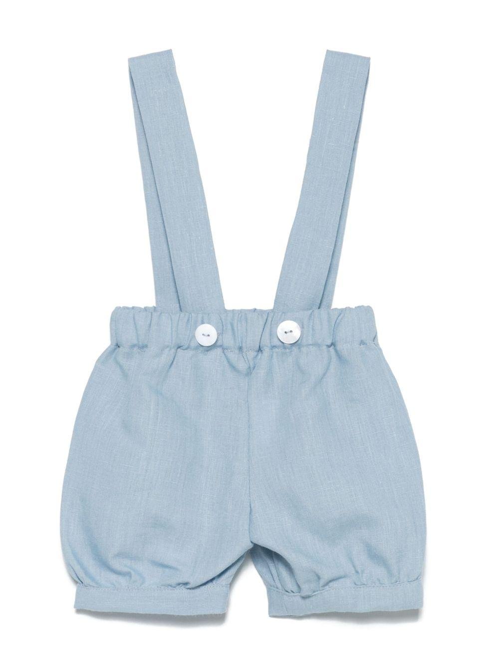The JESURUM BABY Leo baby boy's short jumpsuit in light blue with button closure is available on the RubinoKids.com online store. Made of 100% linen, it features a light blue color, button closure, an elasticated waist, and rolled-up cuffs. Available in various sizes, it is part of the JESURUM BABY Spring/Summer 2025 collection and is available for immediate shipment with delivery within 24/48 hours in Italy.