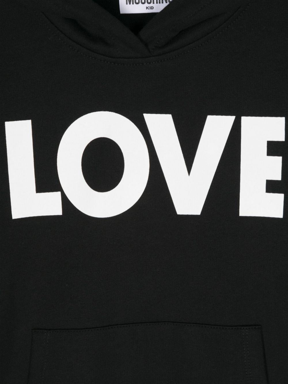 The Moschino Kids black sweatshirt with ribbed cuffs for girls is available on the RubinoKids.com online store. Made of 100% cotton, the sweatshirt features a black/white jersey cotton fabric, a hood, a text print, a logo print on the sleeve, a front kangaroo pocket, long sleeves, and a ribbed hem and cuffs. Available in various sizes, it is part of the Moschino Kids Fall/Winter 2024 collection and is available for immediate shipment with delivery within 24-48 hours in Italy.