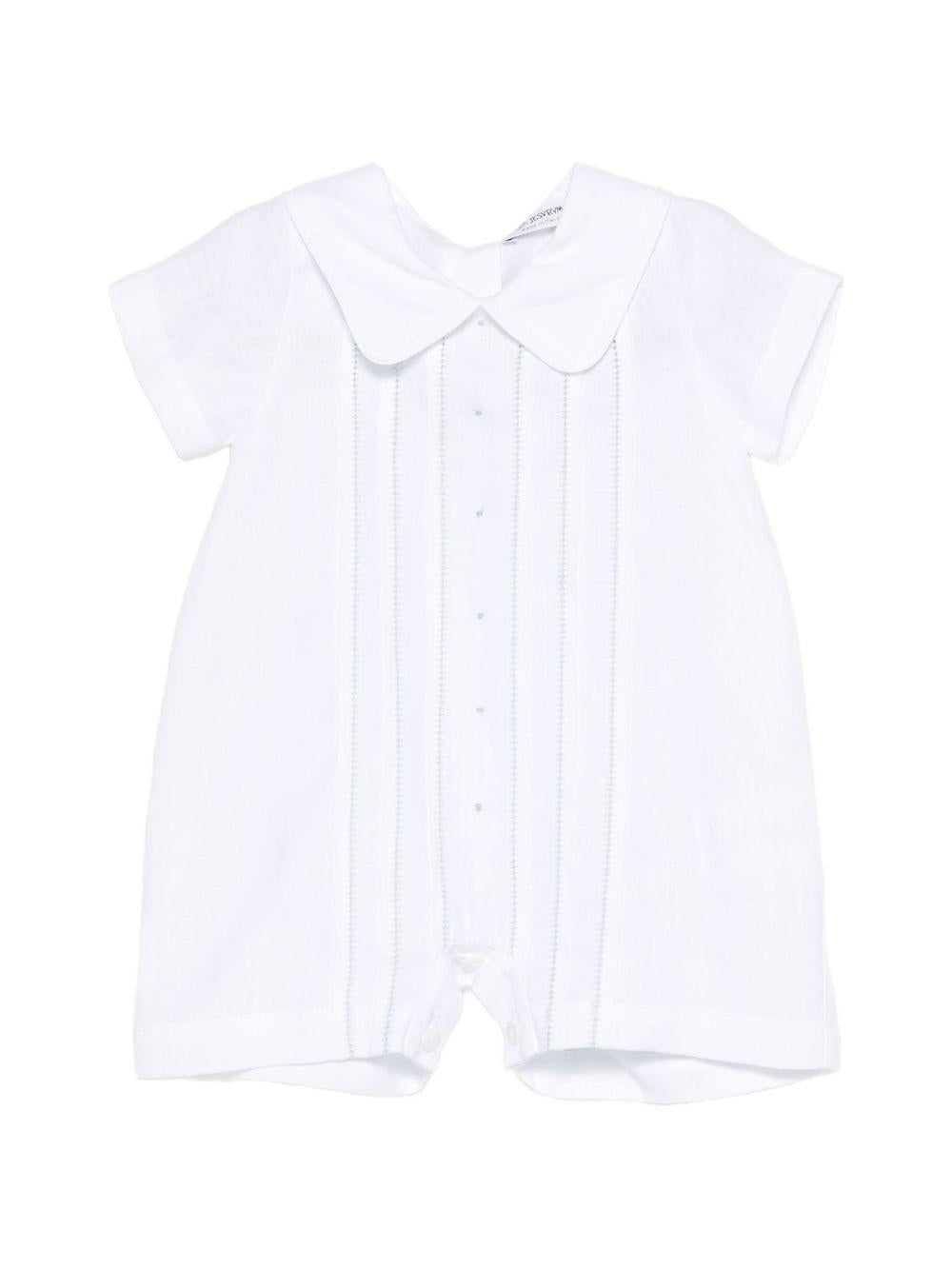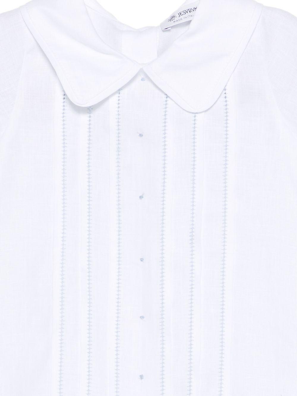 The JESURUM BABY white baby onesie with Peter Pan collar is available on the RubinoKids.com online store. Made of 100% linen, it features a white Peter Pan collar and a front button closure. Available in various sizes, it is part of the JESURUM BABY Spring/Summer 2026 collection and is available for delivery in Italy within 24-48 hours.
