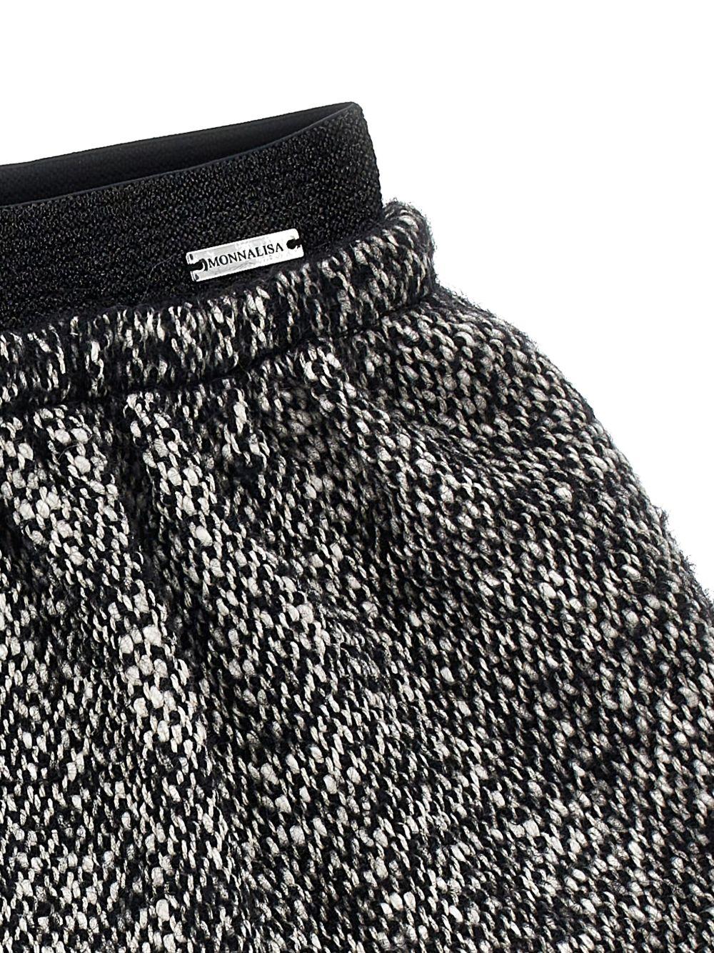 The Monnalisa black skirt with fringed hem for girls is available on the RubinoKids.com online store. Made of 100% fabric, it features a black/white elastic waistband, a silver logo plaque, and a fringed hem. Available in various sizes, it is part of the Monnalisa Fall/Winter 2025 collection and is available for immediate shipment with delivery within 24-48 hours in Italy.