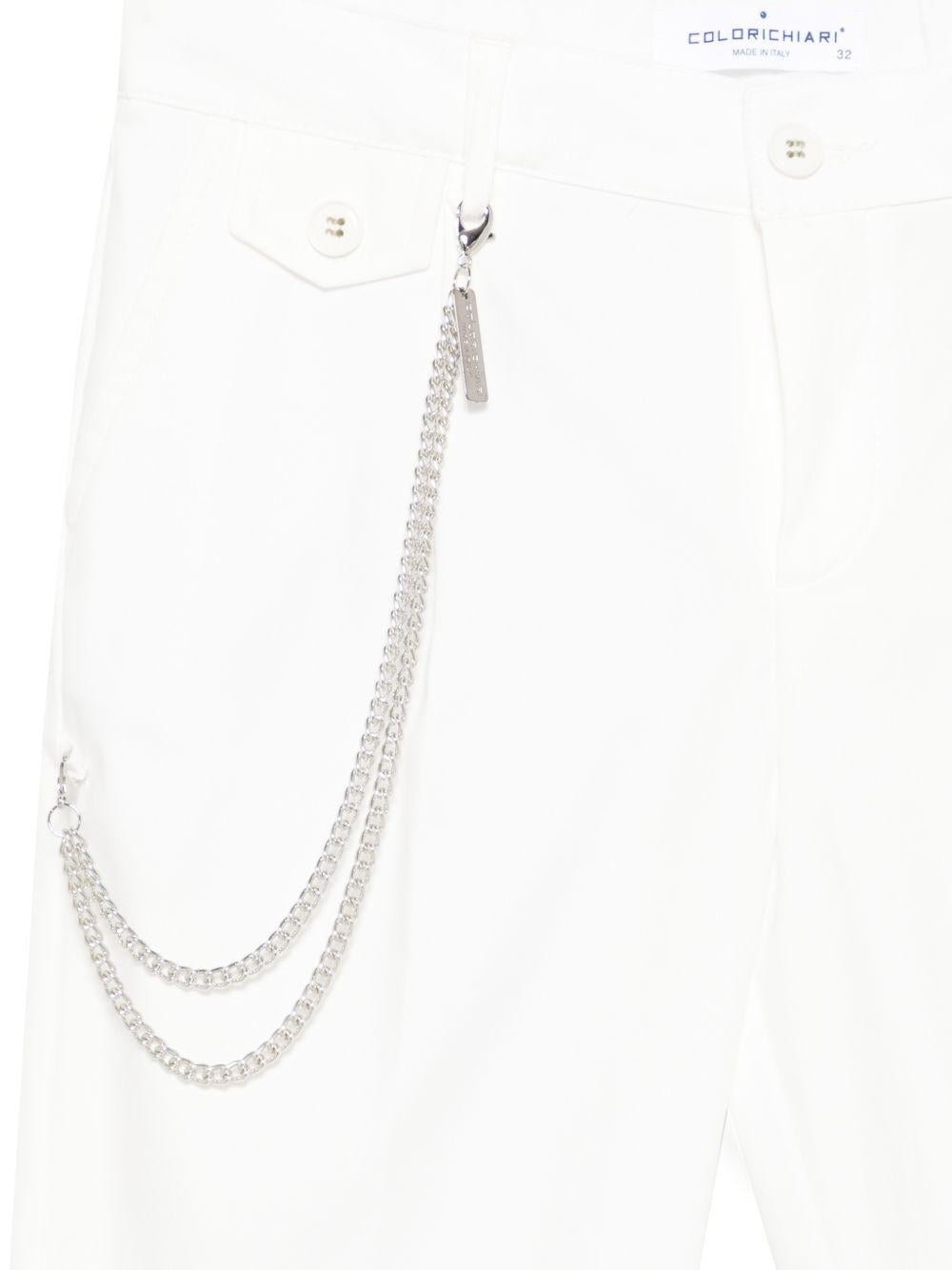 The Colorichiari white double-breasted three-piece suit for boys is available on the RubinoKids.com online store. Made from 71% cotton, 26% nylon, and 3% elastane, it features a white double-breasted jacket, gold-tone buttons, a chain detail, peak lapels, and a matching bow and handkerchief. Available in various sizes, it is part of the Colorichiari Spring/Summer 2026 collection and is available for 24-48 hour delivery in Italy.