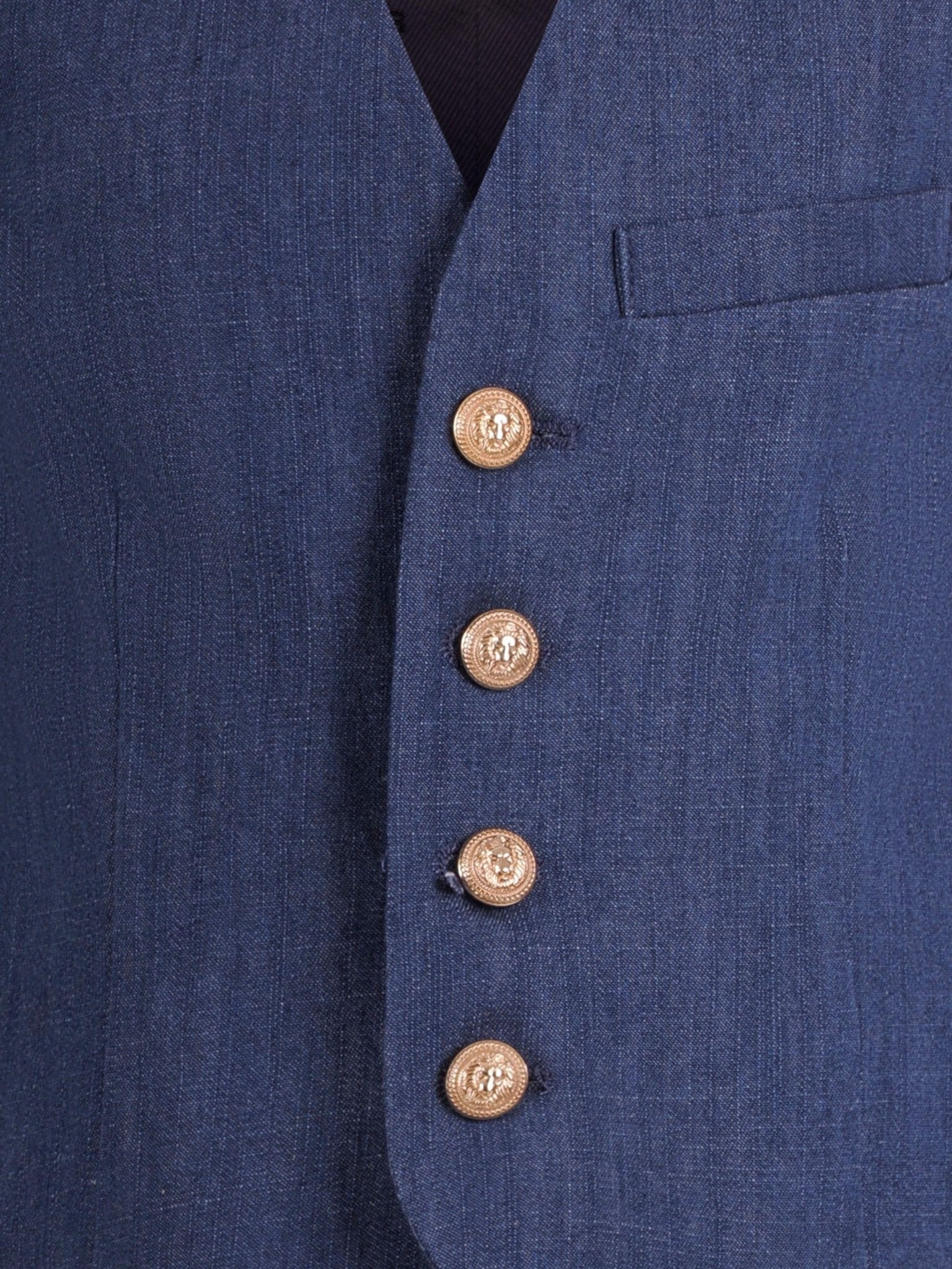 The Balmain Kids blue vest with gold buttons for boys is available on the RubinoKids.com online store. Made of 100% cotton, it features a blue color, gold buttons, a V-neck, and sleeveless design. Available in various sizes, it is part of the Balmain Kids Spring/Summer 2026 collection and is available for 24-48 hour delivery in Italy.