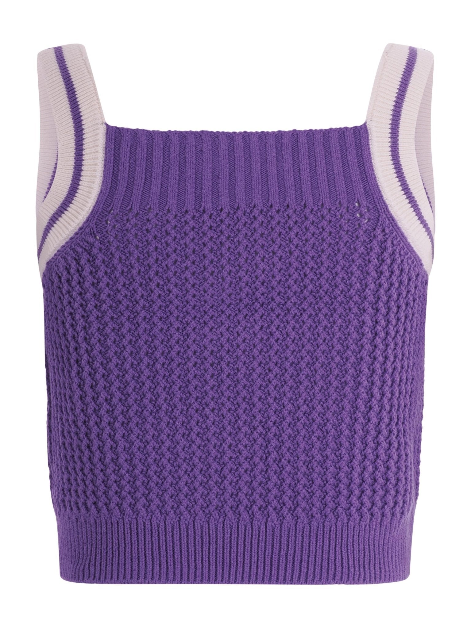The Bonpoint purple cherry-patterned top for girls is available on the RubinoKids.com online store. Made of 100% cotton, it features a purple color, a cherry motif, a striped trim, a square neckline, and sleeveless styling. Available in various sizes, it is part of the Bonpoint Spring/Summer 2026 collection and is available for 24-48 hour delivery in Italy.