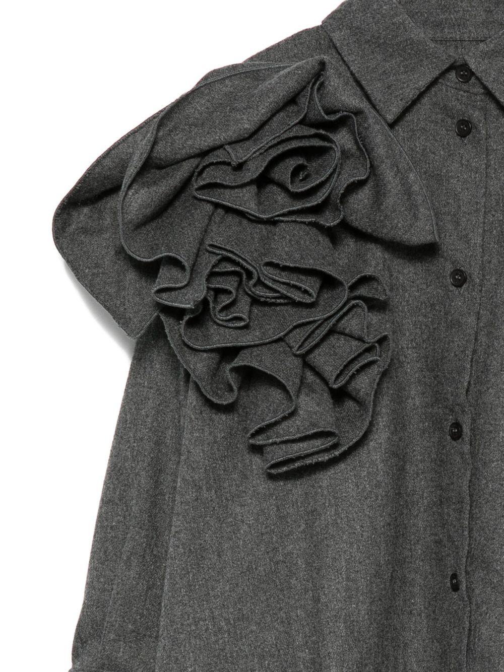 The Douuod Kids product is available on the RubinoKids.com online store. Made of 40% wool, 30% viscose, 29% polyester, 1% elastane, the gray product features ruffled details, a button closure, long sleeves, and a point collar. Available in various sizes, it is part of the Douuod Kids Fall/Winter 2025 collection and is available for 24-48 hour delivery in Italy.