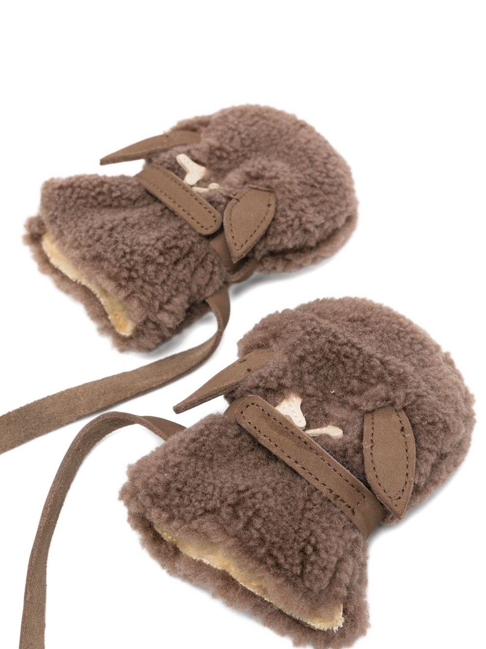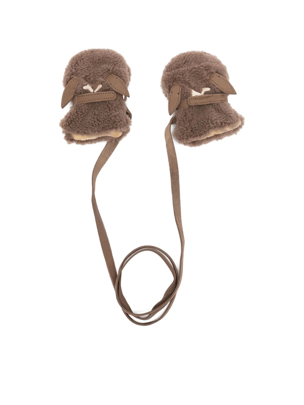 The Donsje brown baby gloves with knotted cuffs is available on the RubinoKids.com online store. Made of 100% polyester and 100% leather, the brown product features a faux fur design, suede trim, ear flap appliques, and knotted cuffs. Available in various sizes, it is part of the Donsje Fall/Winter 2025 collection and is available for 24-48 hour delivery in Italy.