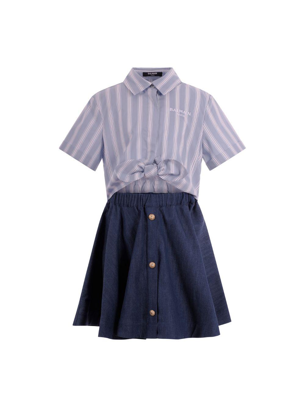 The multicolor Balmain Kids girls' dress with front logo is available on the RubinoKids.com online store. Made of 100% cotton, it features a light blue/denim color, a classic polo neck, a front logo, a front button closure, a bow detail, short sleeves, a striped design, an elastic waistband, and gold button closure. Available in various sizes, it is part of the Balmain Kids Spring/Summer 2026 collection and is available for 24-48 hour delivery in Italy.
