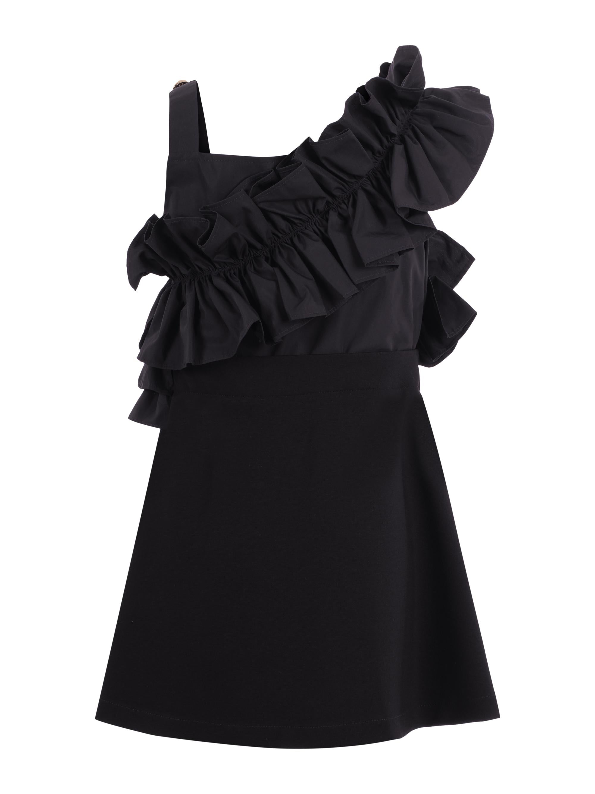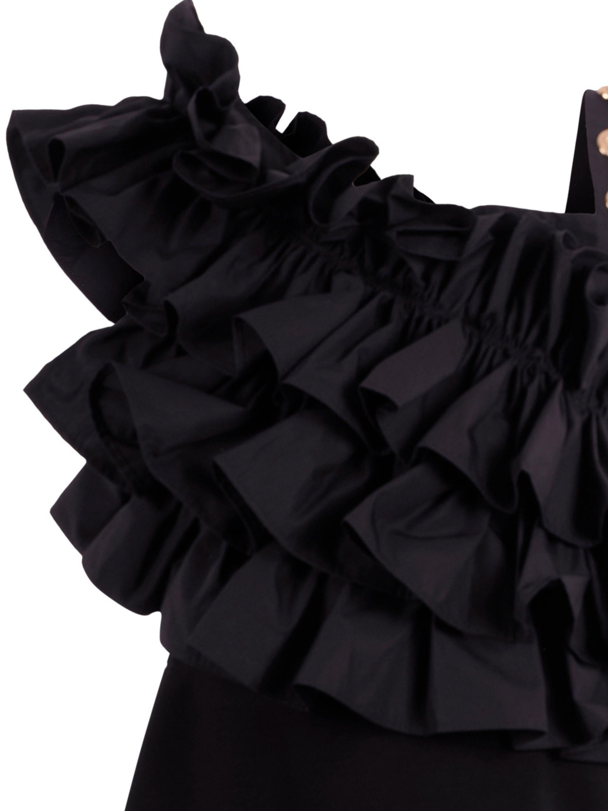 The Balmain Kids black ruffled dress for girls is available on the RubinoKids.com online store. Made of 100% cotton, it features black ruffles, suspenders, gold buttons, and a flared skirt. Available in various sizes, it is part of the Balmain Kids Spring/Summer 2026 collection and is available for 24-48 hour delivery in Italy.