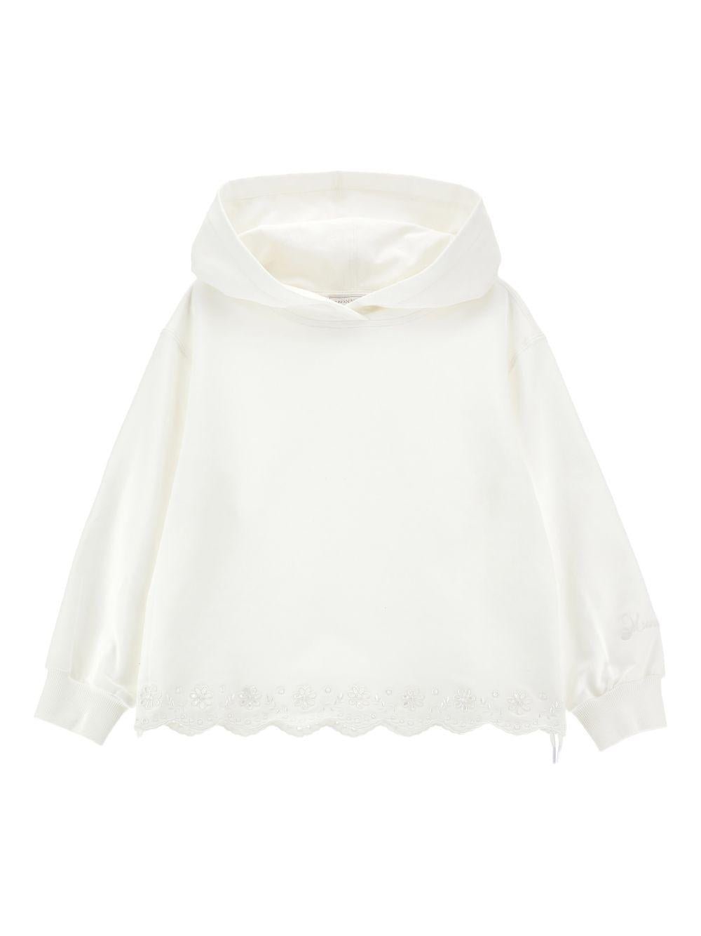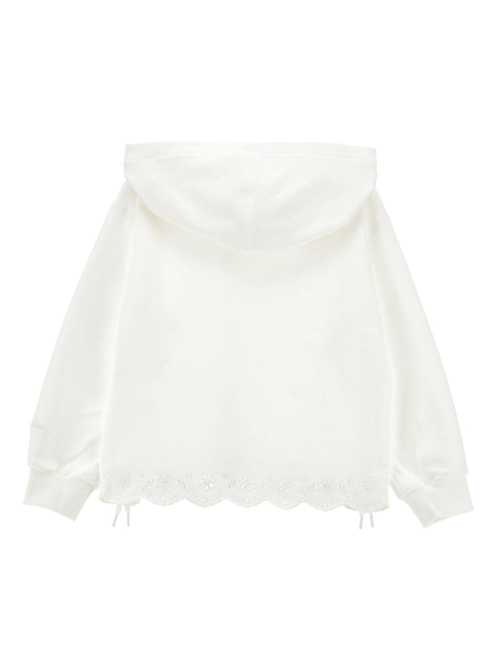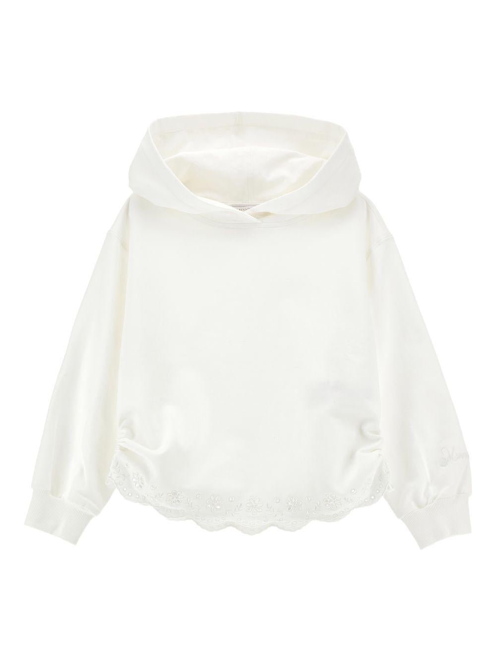 The Monnalisa white sweatshirt for girls with scalloped hem is available on the RubinoKids.com online store. Made of 100% cotton, it features a scalloped hem, a drawstring closure, long sleeves, a hood, and gathered detailing. Available in various sizes, it is part of the Monnalisa Spring/Summer 2026 collection and is available for delivery in Italy within 24-48 hours.