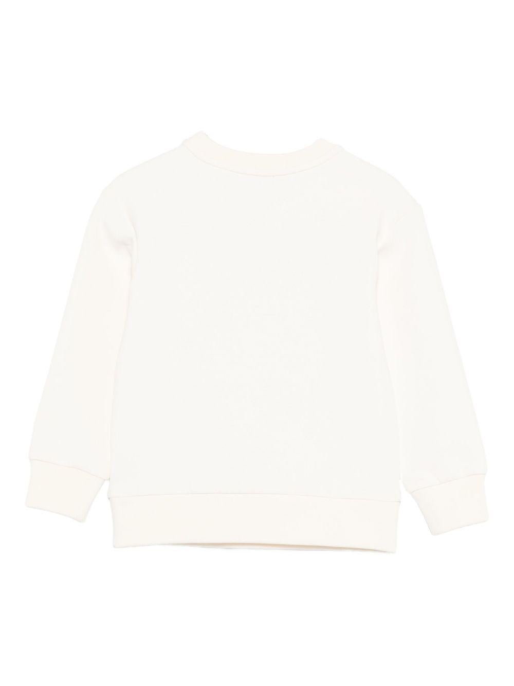 The Moschino Kids white sweatshirt with music note motif is available on the RubinoKids.com online store. Made of 73% cotton, 21% polyester, and 6% elastane, it features a white crew neck, a music note motif, a bear graphic, long sleeves, a logo, and lettering. Available in various sizes, it is part of the Moschino Kids Fall/Winter 2025 collection and is available for 24-48 hour delivery in Italy.