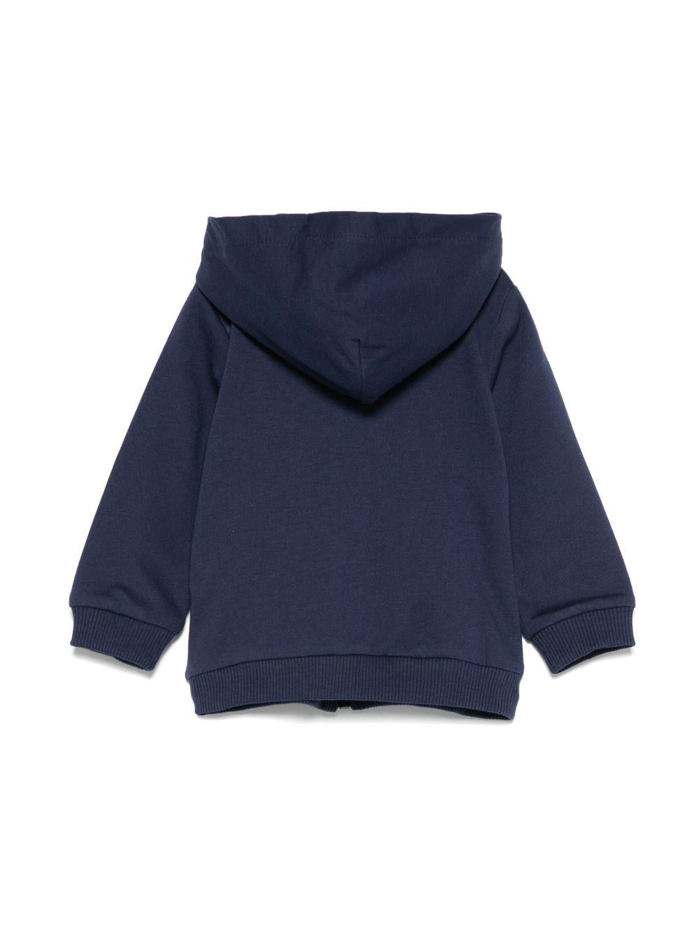 The Moschino Kids blue Teddy Bear hoodie for babies with two side pockets is available on the RubinoKids.com online store. Made of 100% cotton, it features a front zip closure, a hood, long sleeves, and two side welt pockets. This size is from the Moschino Kids Spring/Summer 2025 collection and is available for immediate shipment with delivery within 24-48 hours in Italy.