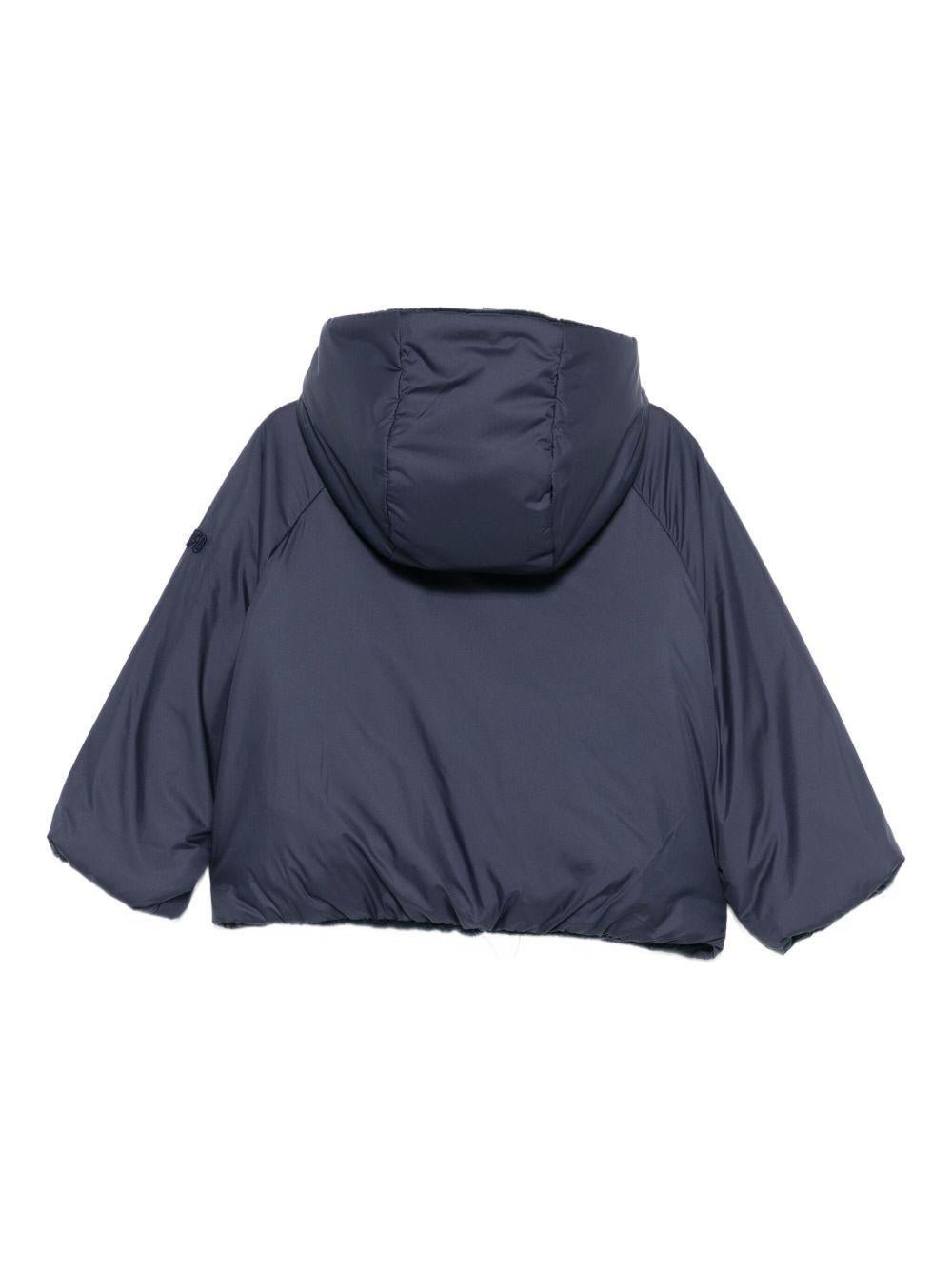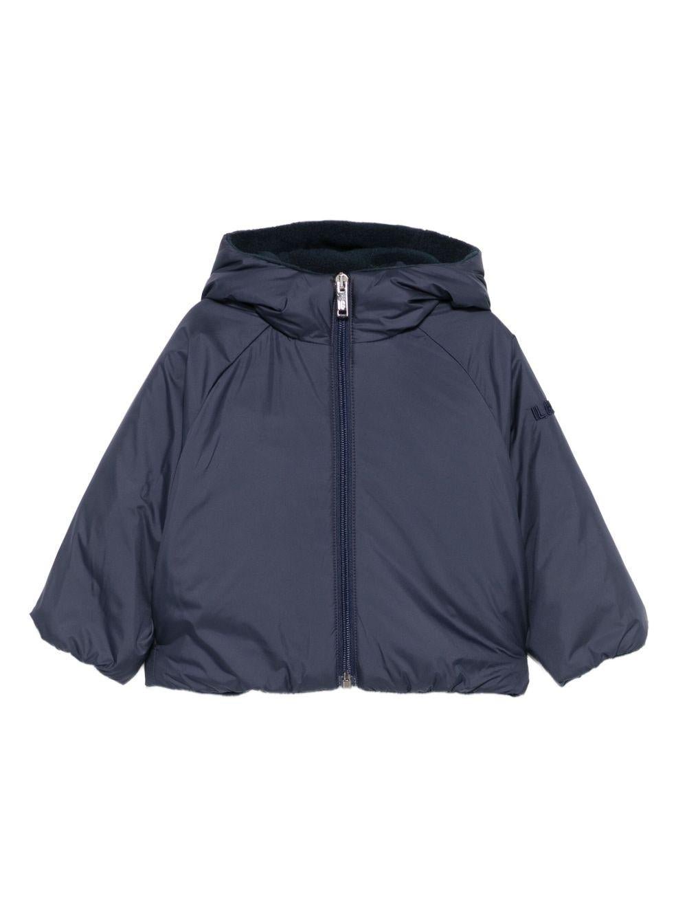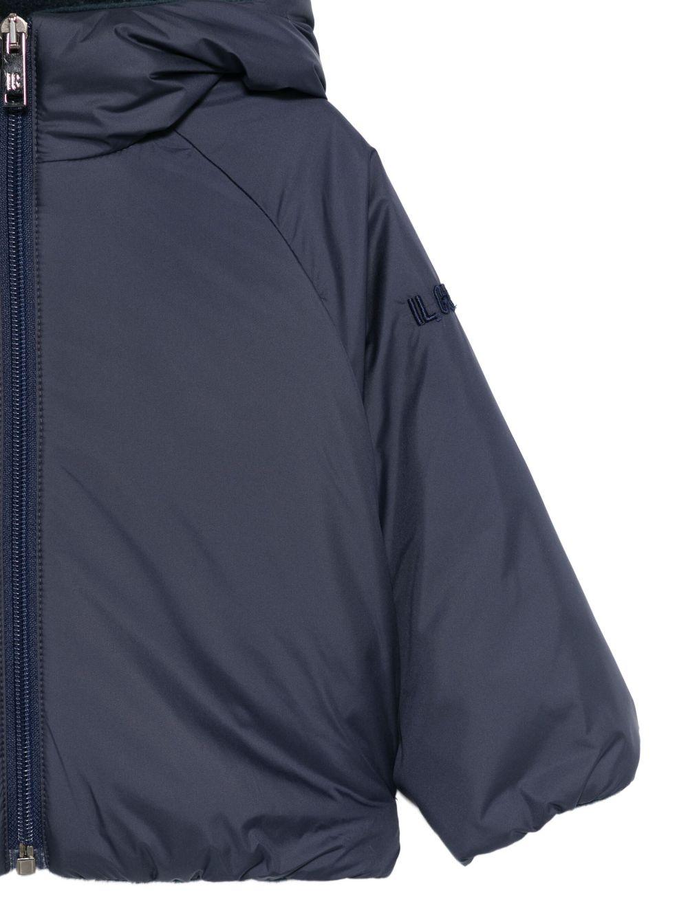 The Il Gufo blue baby jacket with logo embroidery on the sleeve is available on the RubinoKids.com online store. Made of 100% polyester, it features a blue hood, zip closure, logo embroidery on the sleeve, and long sleeves. Available in various sizes, it is part of the Il Gufo Fall/Winter 2025 collection and is available for 24-48 hour delivery in Italy.