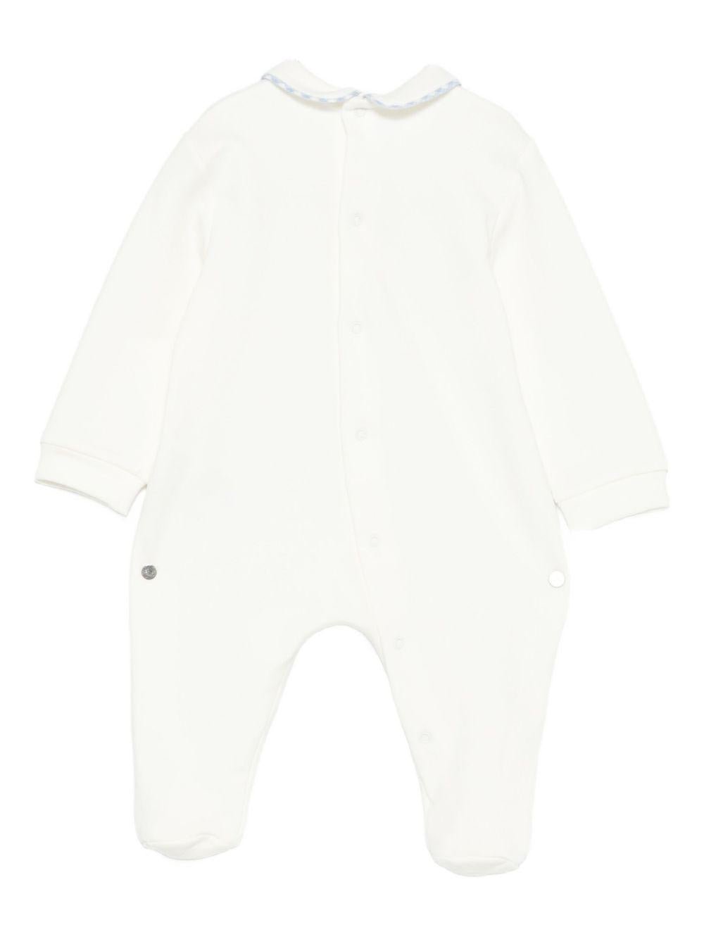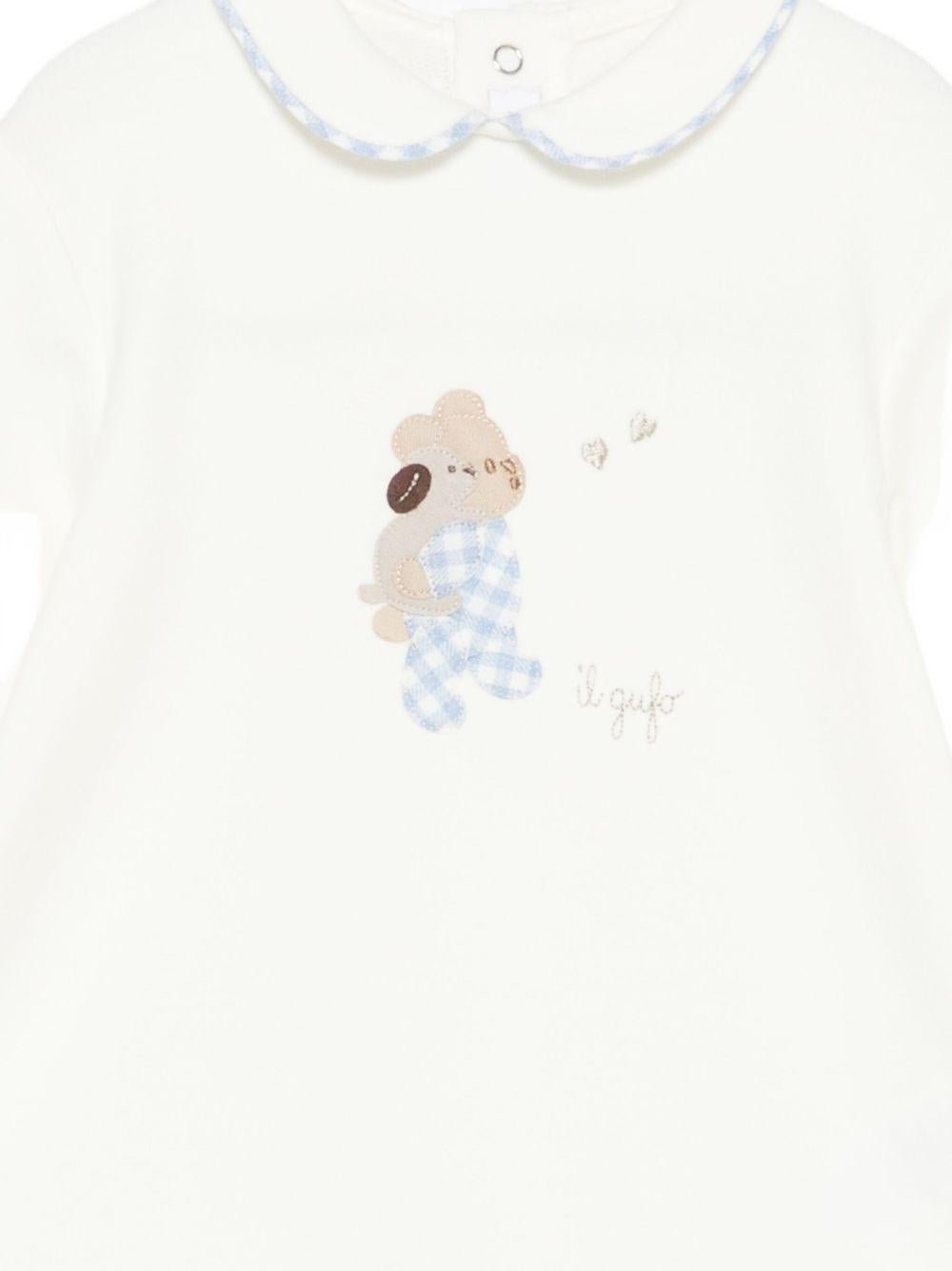 The Il Gufo white baby onesie with animal embroidery on the front is available on the RubinoKids.com online store. Made of 100% cotton, it features a white Peter Pan collar, long sleeves, feet, and a snap closure. Available in various sizes, it is part of the Il Gufo Fall/Winter 2025 collection and is available for 24-48 hour delivery in Italy.